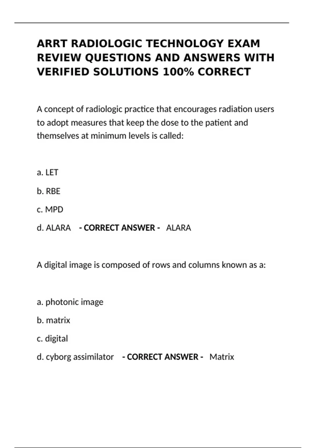 Prepare for the ARRT Radiologic Technology exam with our comprehensive review featuring verified questions and answers. Covering patient care, radiation safety, imaging principles, anatomy, and more—all 100% correct and exam-ready.