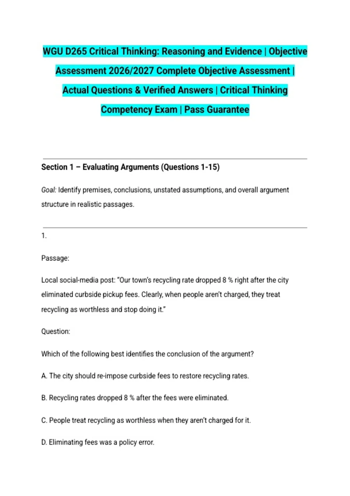 WGU D265 Critical Thinking: Reasoning and Evidence | Objective Assessment 2026/2027 Complete Objective Assessment | Actual Questions & Verified Answers | Critical Thinking Competency Exam | Pass Guarantee