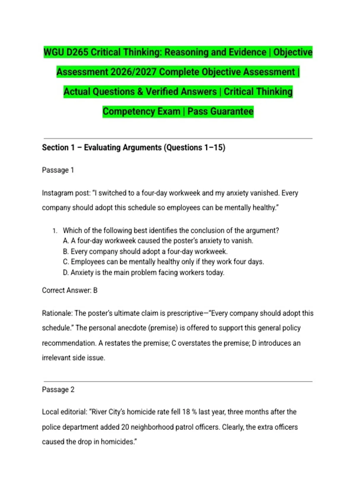 WGU D265 Critical Thinking: Reasoning and Evidence | Objective Assessment 2026/2027 Complete Objective Assessment | Actual Questions & Verified Answers | Critical Thinking Competency Exam | Pass Guarantee
