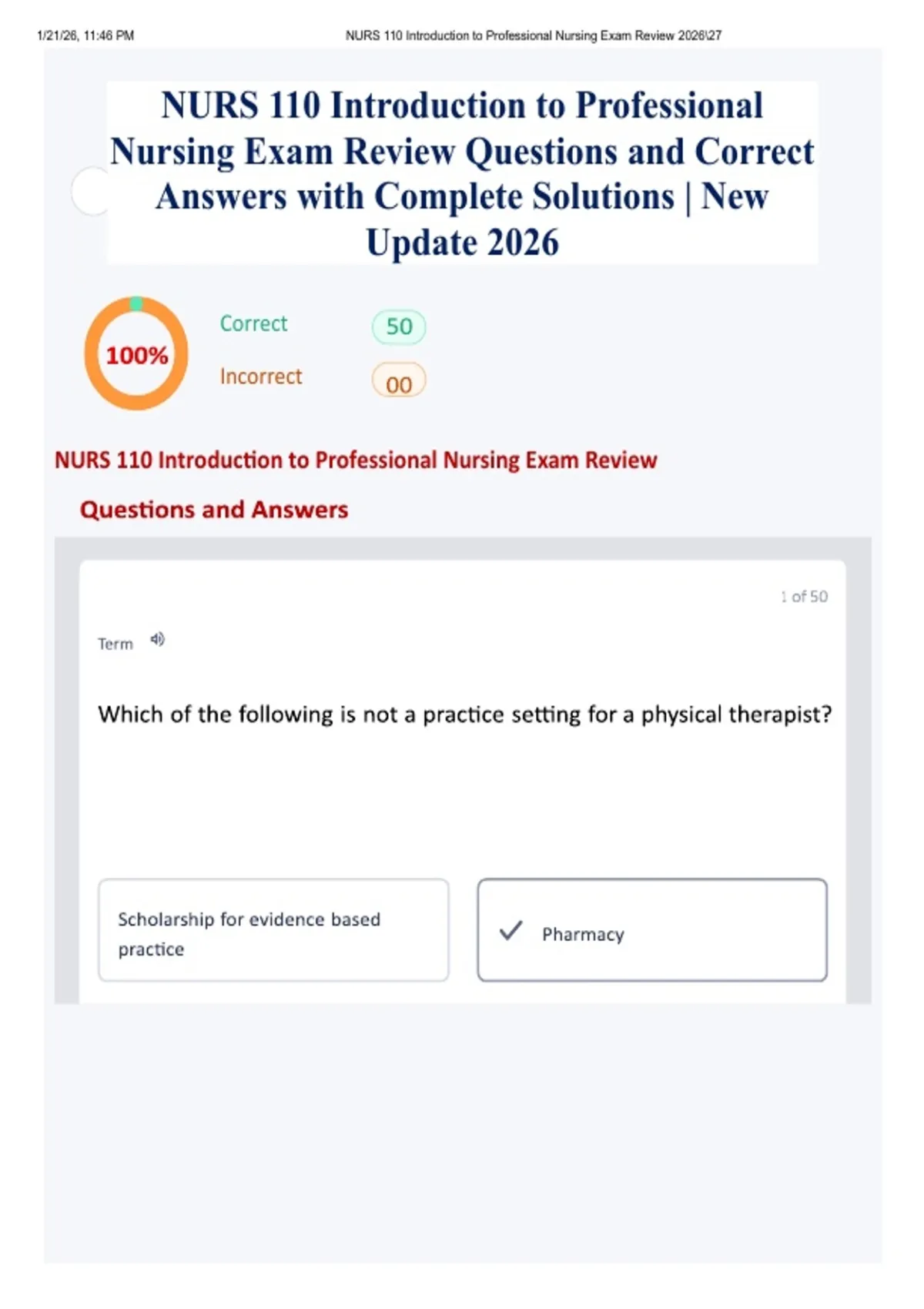 , 1/21/26, 11:46 PM NURS 110 Introduction to Professional Nursing Exam Review 2026\27