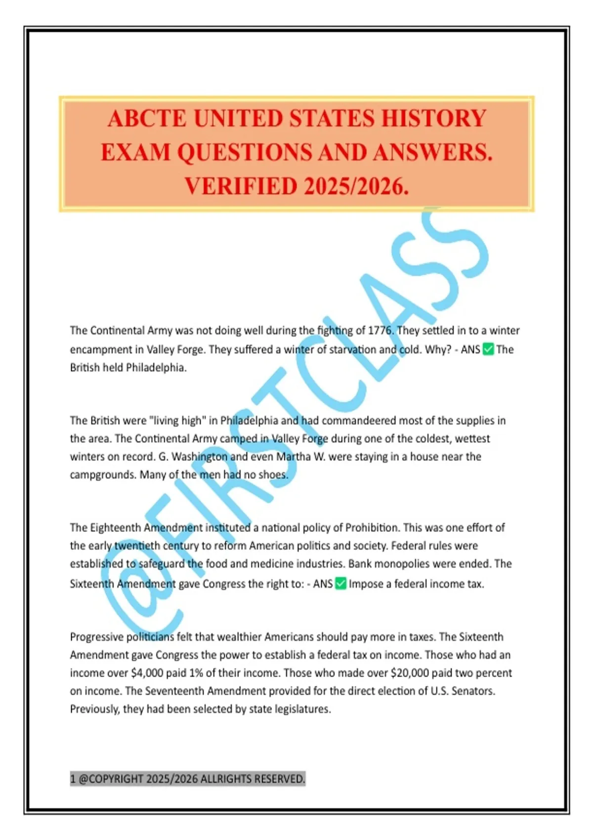 ABCTE UNITED STATES HISTORY EXAM QUESTIONS AND ANSWERS. VERIFIED 2025/2026.