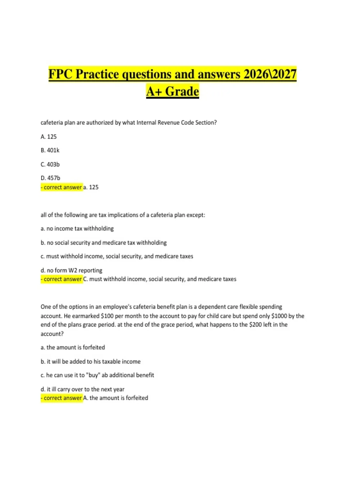 This study guide provides practice questions for the FPC (Fundamental Payroll Certification) Exam, covering payroll fundamentals, tax calculations, employee classifications, wage and hour laws, benefits administration, payroll reporting, and compliance procedures. It includes exam-style questions with clear, verified answers to support effective preparation for the 2026–2027 certification cycle. The material is structured to reinforce payroll knowledge, calculation accuracy, and exam readiness, helping candidates achieve an A+ grade.