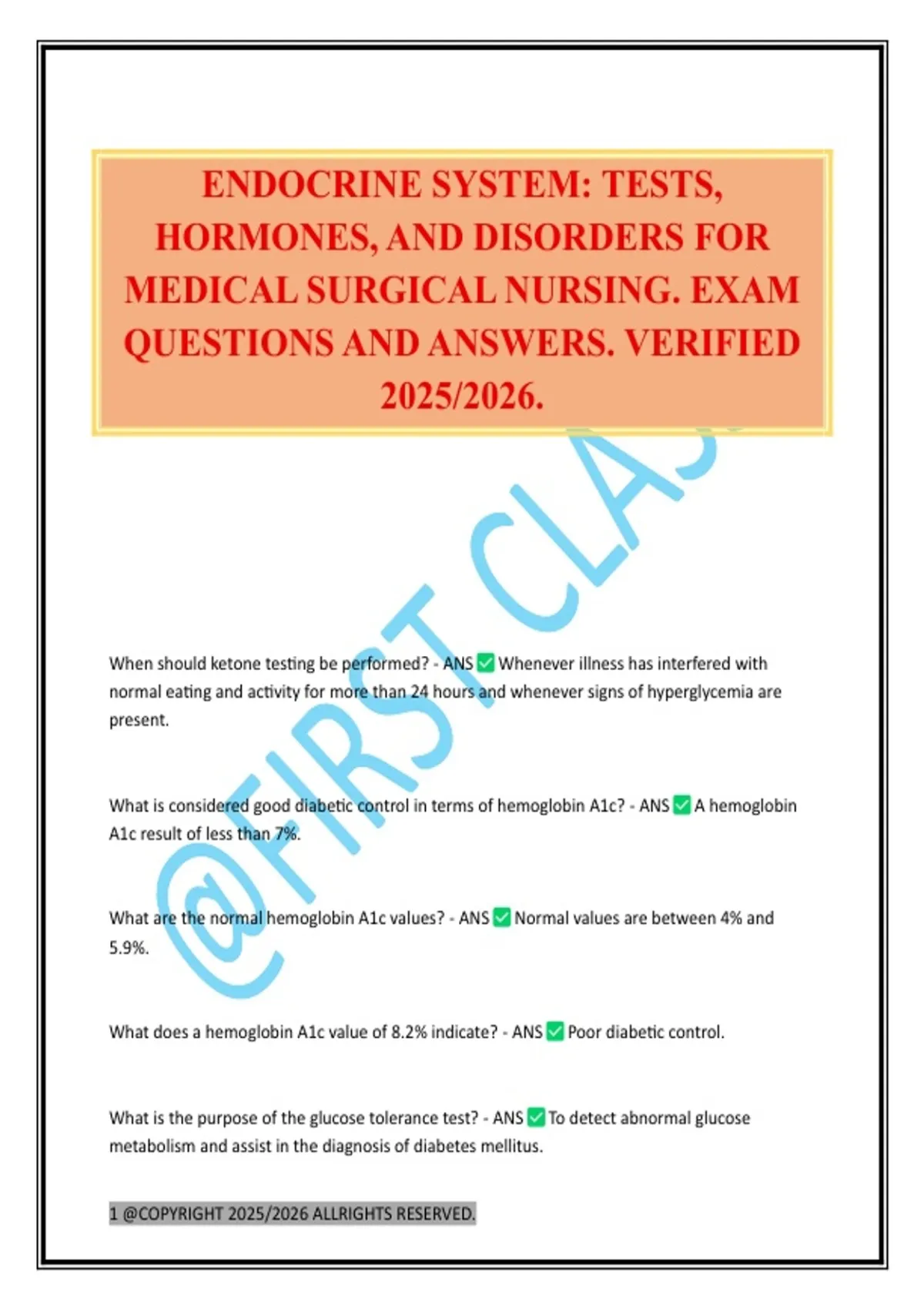 ENDOCRINE SYSTEM: TESTS, HORMONES, AND DISORDERS FOR MEDICAL SURGICAL NURSING. EXAM QUESTIONS AND ANSWERS. VERIFIED 2025/2026.