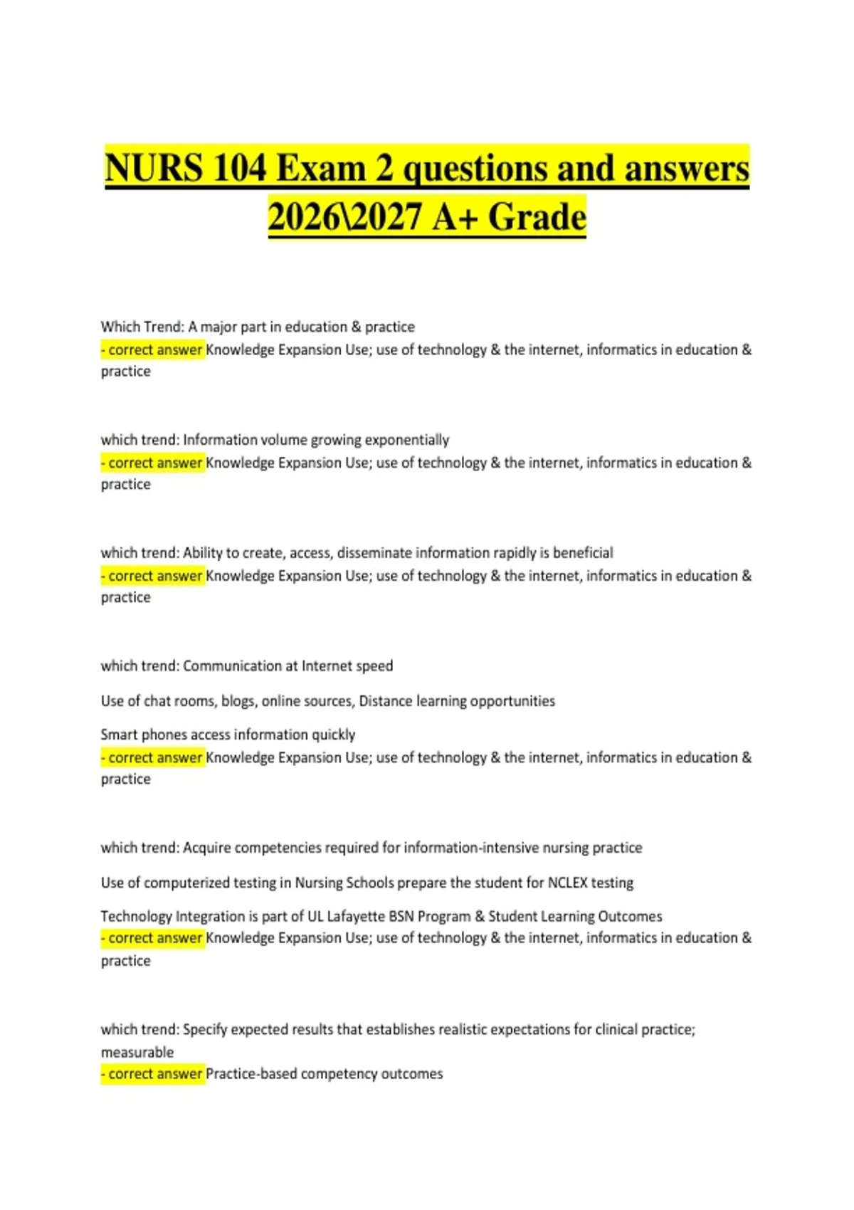 This study guide covers NURS 104 Exam 2, including topics such as patient assessment, vital signs, basic nursing skills, safety and infection control, communication, documentation, and introduction to clinical reasoning. It includes exam-style questions with verified, accurate answers to support effective preparation for the 2026–2027 academic year. The material is structured to reinforce foundational nursing knowledge, critical thinking, and exam readiness, helping students achieve an A+ grade.