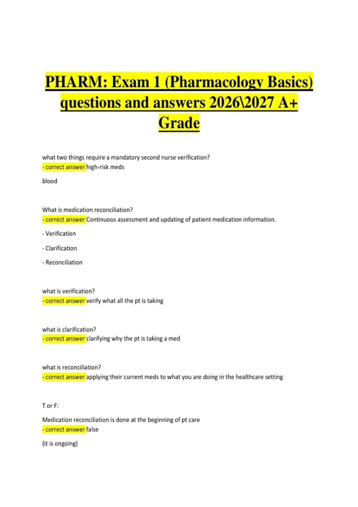 This study guide covers Pharmacology Exam 1: Pharmacology Basics, including topics such as drug classifications, mechanisms of action, pharmacokinetics, pharmacodynamics, therapeutic uses, adverse effects, and foundational nursing considerations for safe medication administration. It includes exam-style questions with verified, accurate answers to support effective preparation for the 2026–2027 academic year. The material is structured to reinforce essential pharmacology knowledge, critical thinking, and exam readiness, helping nursing students achieve an A+ grade.