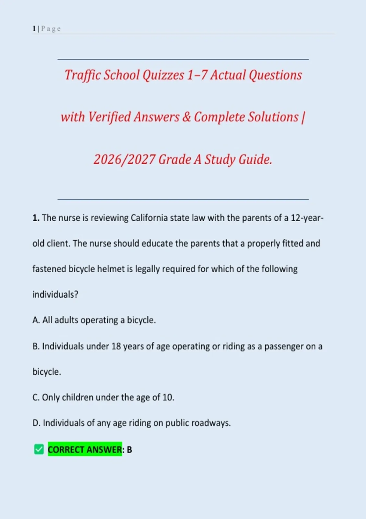 This comprehensive Traffic School study guide covers Quizzes 1 through 7, providing exam-aligned, actual-style questions with verified answers and complete solutions. The content reflects current traffic school curricula and approved course standards for the 2026/2027 cycle, ensuring accurate and effective preparation. Designed for drivers completing traffic school for ticket dismissal, point reduction, court compliance, or insurance requirements, this resource covers essential topics including traffic laws, defensive driving strategies, road signs and signals, right-of-way rules, speed limits, DUI awareness, and safe driving practices. Each question includes clear explanations to reinforce understanding and practical application. Aligned with current traffic school quiz formats, this study guide supports efficient review, confidence-building, and successful completion of all required quizzes. It is an essential tool for achieving Grade A results and completing traffic school requirements with confidence.
