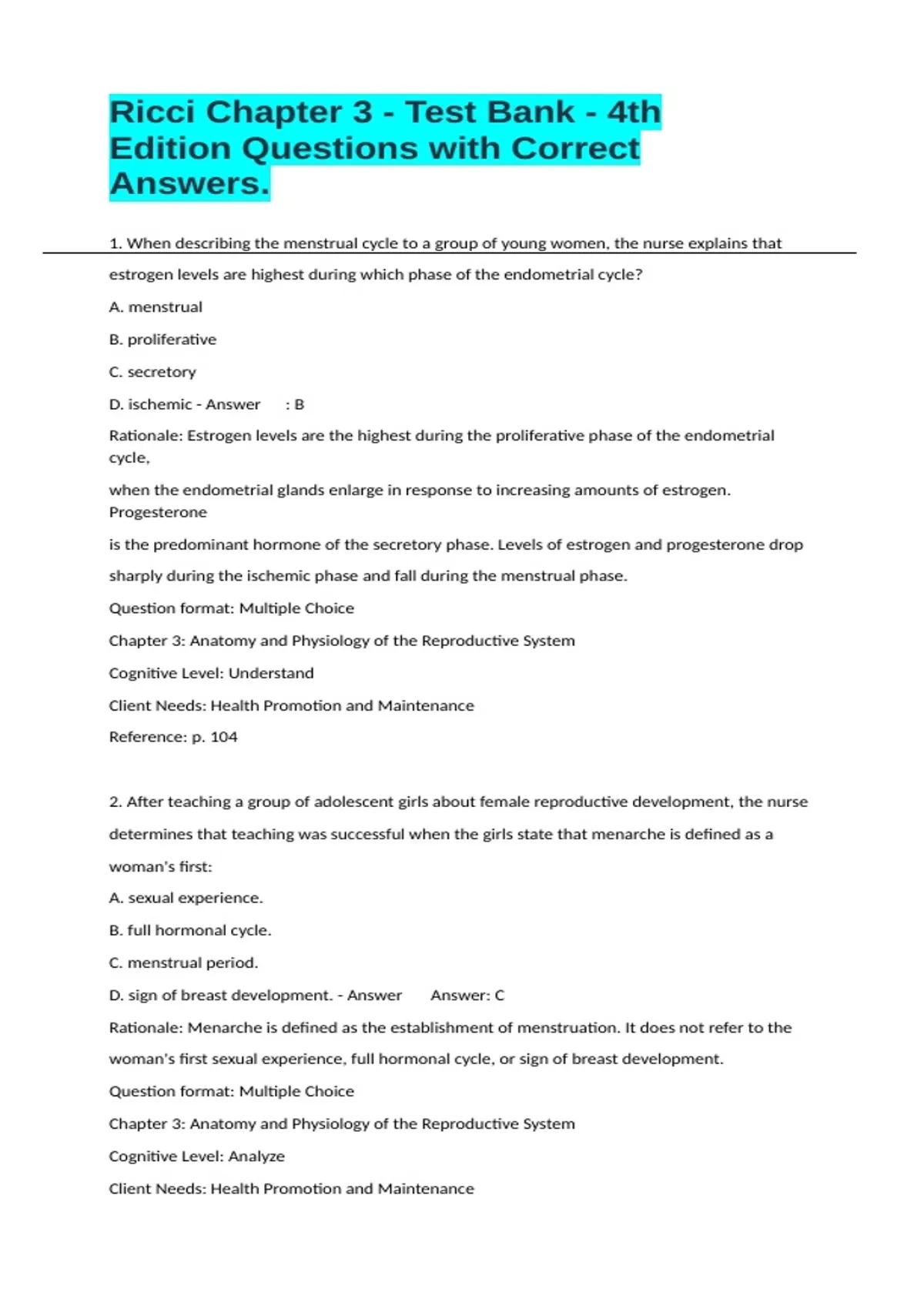 when the endometrial glands enlarge in response to increasing amounts of estrogen. Progesterone is the predominant hormone of the secretory phase. Levels of estrogen and progesterone drop sharply during the ischemic phase and fall during the menstrual phase. Question format: Multiple Choice Chapter 3: Anatomy and Physiology of the Reproductive System Cognitive Level: Understand Client Needs: Health Promotion and Maintenance Reference: p. 104 2. After teaching a group of adolescent girls about female reproductive development, the nurse determines that teaching was successful when the girls state that menarche is defined as a woman's first: A. sexual experience. B. full hormonal cycle. C. menstrual period.
