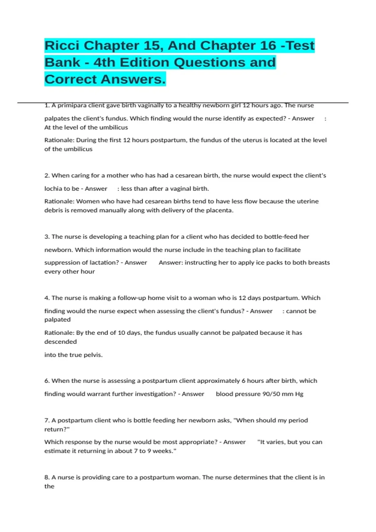 1. A primipara client gave birth vaginally to a healthy newborn girl 12 hours ago. The nurse palpates the client's fundus. Which finding would the nurse identify as expected? - Answer : At the level of the umbilicus Rationale: During the first 12 hours postpartum, the fundus of the uterus is located at the level of the umbilicus 2. When caring for a mother who has had a cesarean birth, the nurse would expect the client's lochia to be - Answer : less than after a vaginal birth. Rationale: Women who have had cesarean births tend to have less flow because the uterine debris is removed manually along with delivery of the placenta. 3. The nurse is developing a teaching plan for a client who has decided to bottle-feed her newborn. Which information would the nurse include in the teaching plan to facilitate suppression of lactation? - Answer Answer: instructing her to apply ice packs to both breasts every other hour 4. The nurse is making a follow-up home visit to a woman who is 12 days postpartum. Which finding would the nurse expect when assessing the client's fundus? - Answer : cannot be palpated Rationale: By the end of 10 days, the fundus usually cannot be palpated because it has descended into the true pelvis. 6. When the nurse is assessing a postpartum client approximately 6 hours after birth, which finding would warrant further investigation? - Answer blood pressure 90/50 mm Hg 7. A postpartum client who is bottle feeding her newborn asks, "When should my period return?" Which response by the nurse would be most appropriate? - Answer "It varies, but you can estimate it returning in about 7 to 9 weeks." 8. A nurse is providing care to a postpartum woman. The nurse determines that the client is in the