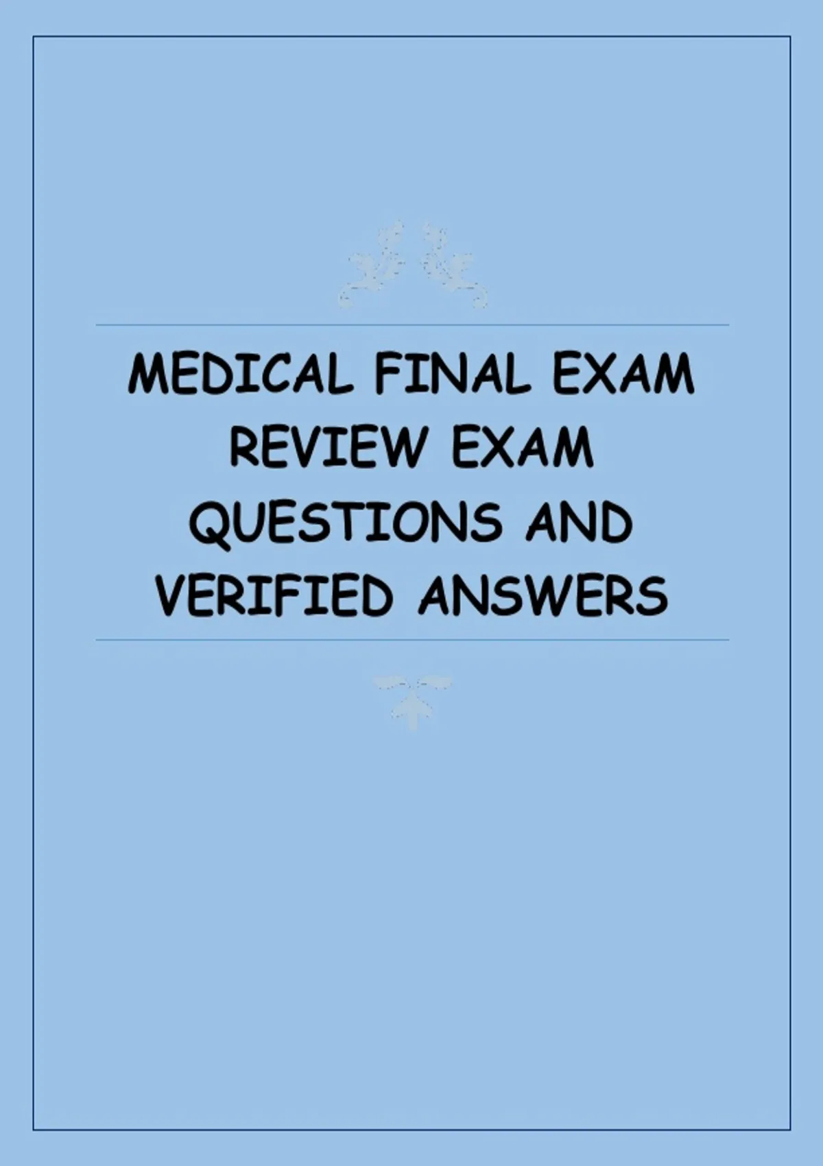 This document provides a comprehensive final exam review with exam-style questions and verified correct answers covering key medical topics. It is designed to support effective revision by focusing on commonly tested concepts, clinical knowledge, and exam-relevant materia