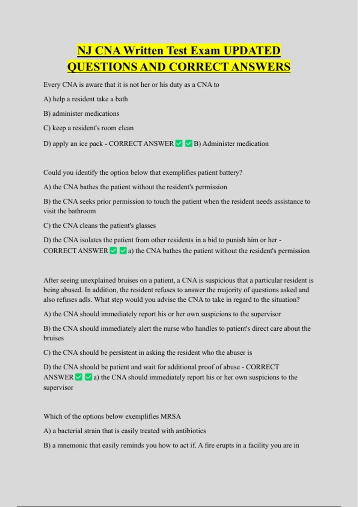 NJ CNA Written Test Exam UPDATED QUESTIONS AND CORRECT ANSWERS Every CNA is aware that it is not her or his duty as a CNA to A) help a resident take a bath B) administer medications C) keep a resident's room clean D) apply an ice pack - CORRECT ANSWER B) Administer medication Could you identify the option below that exemplifies patient battery? A) the CNA bathes the patient without the resident's permission B) the CNA seeks prior permission to touch the patient when the resident needs assistance to visit the bathroom C) the CNA cleans the patient's glasses D) the CNA isolates the patient from other residents in a bid to punish him or her - CORRECT ANSWER a) the CNA bathes the patient without the resident's permission After seeing unexplained bruises on a patient, a CNA is suspicious that a particular resident is being abused. In addition, the resident refuses to answer the majority of questions asked and also refuses adls. What step would you advise the CNA to take in regard to the situation? A) the CNA should immediately report his or her own suspicions to the supervisor B) the CNA should immediately alert the nurse who handles to patient's direct care about the bruises C) the CNA should be persistent in asking the resident who the abuser is D) the CNA should be patient and wait for additional proof of abuse - CORRECT ANSWER a) the CNA should immediately report his or her own suspicions to the supervisor Which of the options below exemplifies MRSA A) a bacterial strain that is easily treated with antibiotics B) a mnemonic that easily reminds you how to act if. A fire erupts in a facility you are in C) activities that residents are expected to engage in so as to remain safe D) a drug-resident bacterial strain that antibiotics cannot easily treat - CORRECT ANSWER d) a drug-resident bacterial strain which antibiotics cannot easily treat