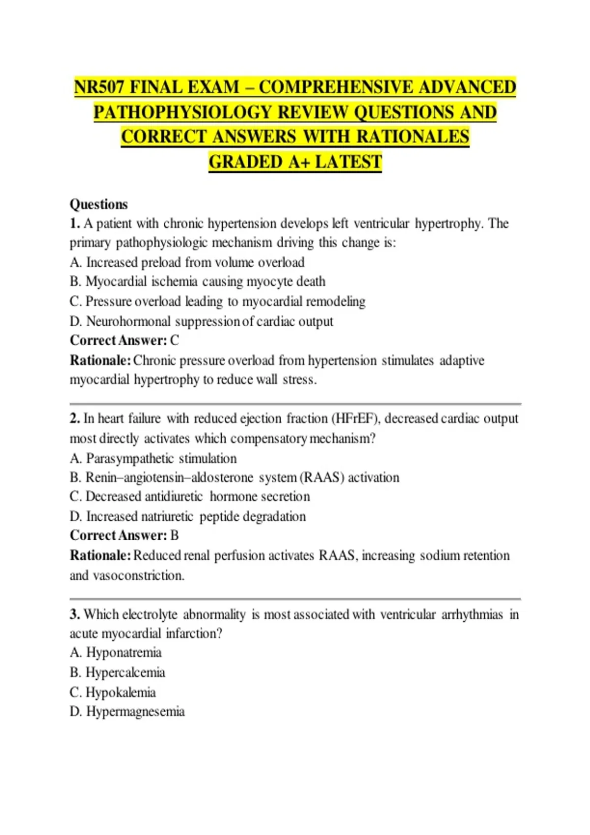 NR507 FINAL EXAM COMPREHENSIVE ADVANCED PATHOPHYSIOLOGY REVIEW, 200+ QUESTIONS AND CORRECT ANSWERS WITH RATIONALES GRADED A+ LATEST. This comprehensive NR507 final examination is designed to evaluate advanced understanding of pathophysiologic mechanisms across the lifespan and body systems. The exam integrates cardiovascular, respiratory, renal, endocrine, neurologic, immune, hematologic, gastrointestinal, musculoskeletal, and multisystem disorders. Questions emphasizing clinical application, disease mechanisms, and complex patient scenarios consistent with graduate-level nursing education and the official NR507 exam style. The assessment supports advanced clinical reasoning and synthesis of pathophysiology concepts essential for safe, evidence-based advanced practice nursing.