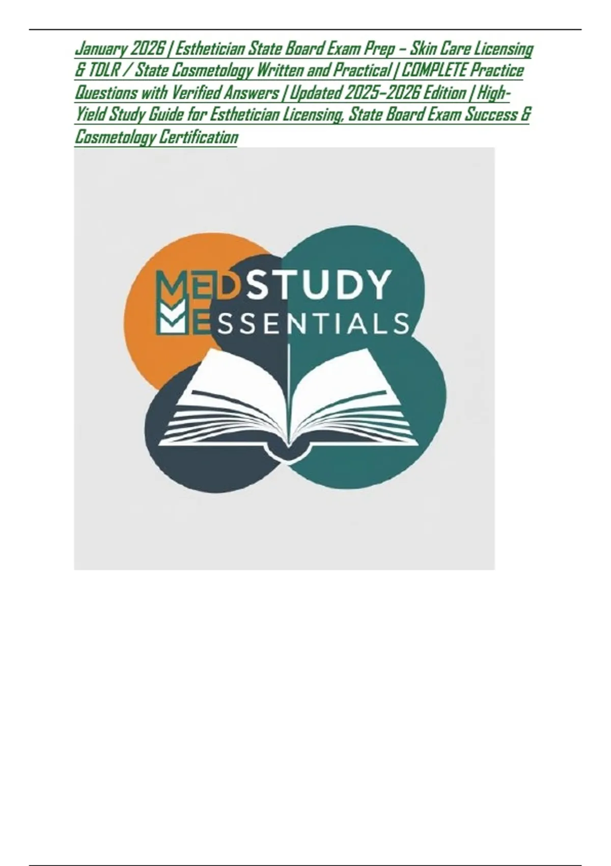 This January 2026 updated Esthetician State Board Exam Prep resource is a comprehensive, state-specific study guide designed to help candidates pass esthetician licensing exams, including written and practical portions, with confidence. It includes high-yield practice questions with verified, accurate answers, fully aligned with current state board and TDLR exam objectives, covering sanitation and safety, skin analysis, facials and hair removal techniques, makeup application, chemical peels, client consultation, and professional ethics. Ideal for esthetician students, apprentices, and re-test candidates, this guide simplifies complex skin care concepts, highlights frequently tested exam topics, and supports efficient, time-saving revision. Whether preparing early or reviewing under pressure, this resource delivers clarity, accuracy, and real exam relevance, making it an essential tool for the 2025–2026 esthetician licensing cycle.