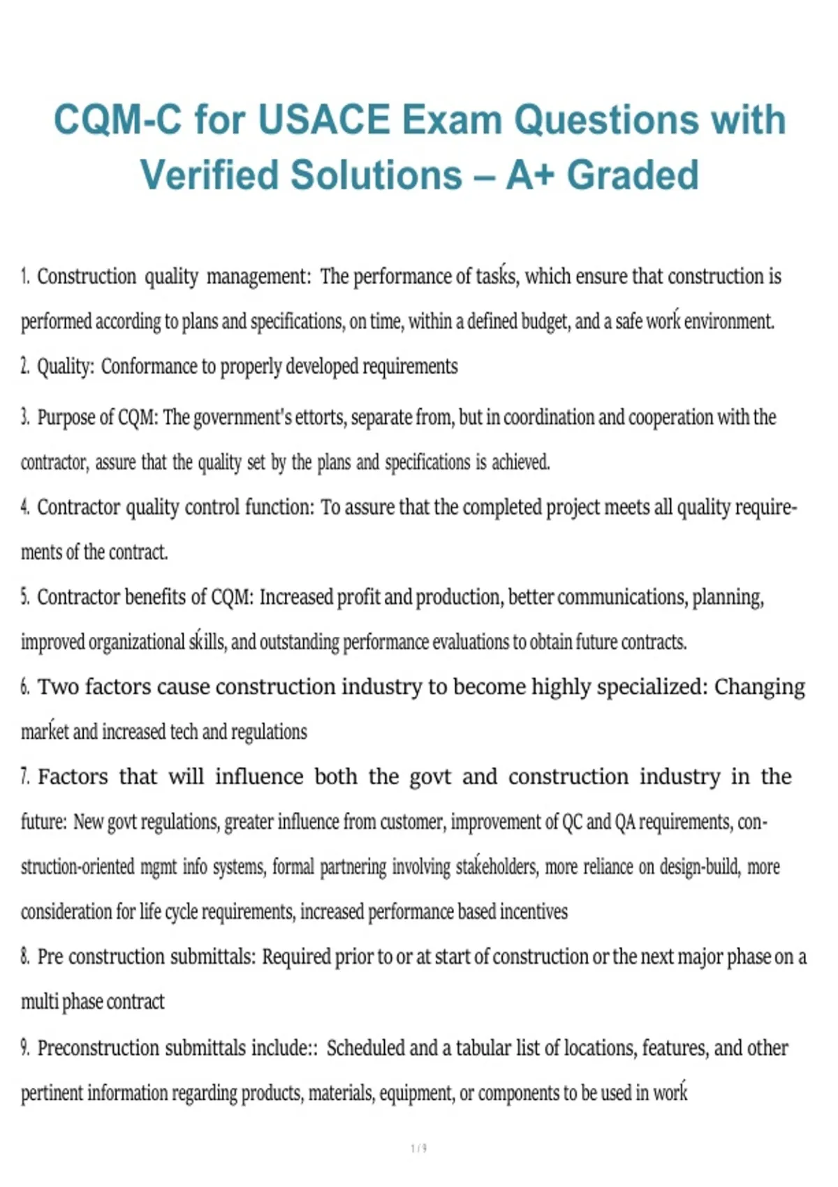 This document provides a full set of CQM-C exam questions with verified solutions specifically tailored for the USACE (U.S. Army Corps of Engineers) certification exam for 2026/2027. It covers all key concepts including quality management principles, project compliance standards, operational procedures, risk management, and performance evaluation, ensuring comprehensive preparation and A+ graded readiness for the USACE CQM-C exam.