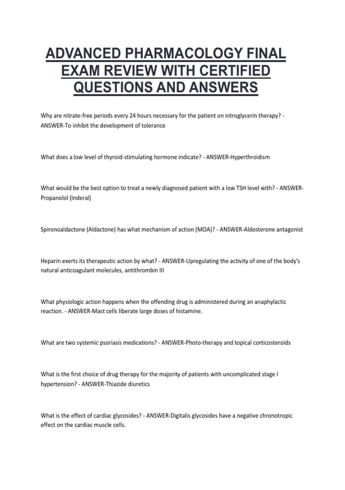 This document provides a comprehensive review of advanced pharmacology material, focused on final exam preparation using certified questions and detailed answers. It covers key drug classes, mechanisms of action, therapeutic uses, adverse effects, and clinical considerations commonly tested in advanced pharmacology courses. The content is designed to support efficient revision and reinforce exam-relevant knowledge.