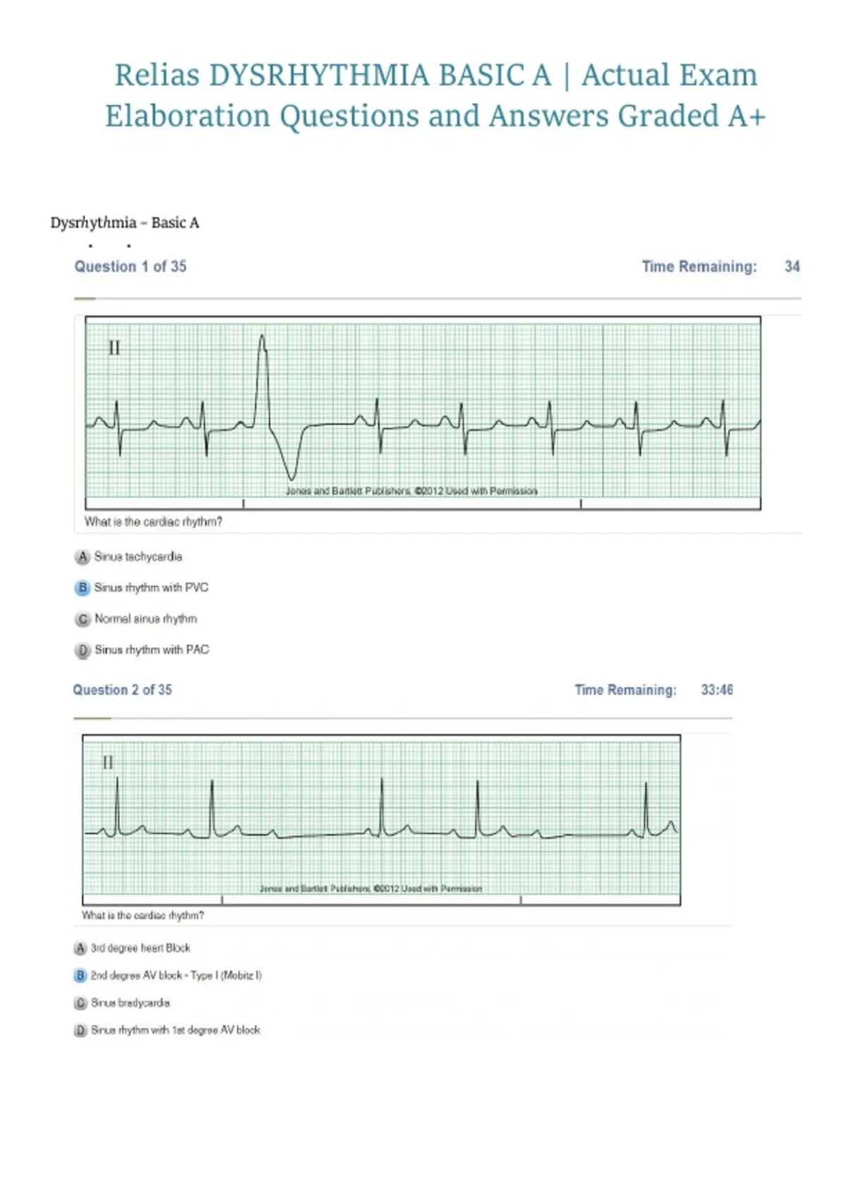 This document provides a comprehensive set of Relias Dysrhythmia Basic A exam elaboration questions with verified answers for the 2026/2027 cycle. It covers essential cardiac dysrhythmia topics including ECG interpretation, arrhythmia classification, treatment protocols, rhythm identification, and patient monitoring, offering a detailed resource for achieving an A+ grade on the exam.
