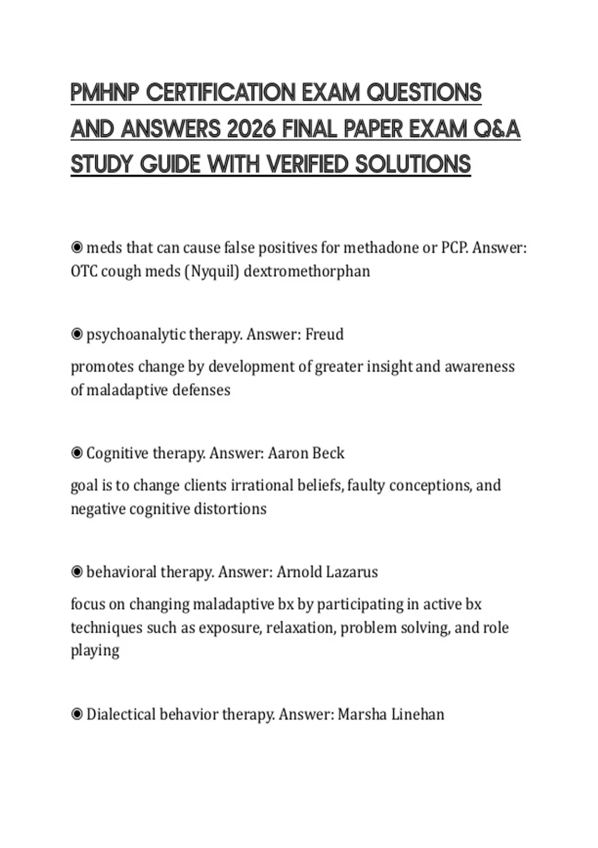 PMHNP CERTIFICATION EXAM QUESTIONS AND ANSWERS 2026 FINAL PAPER EXAM Q&A STUDY GUIDE WITH VERIFIED SOLUTIONS