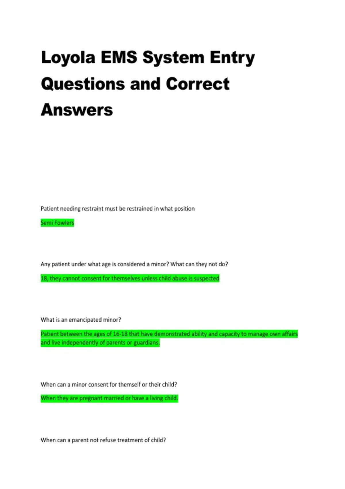 , Loyola EMS System Entry Questions and Correct