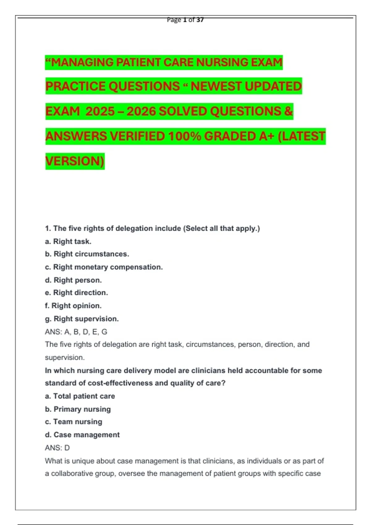“MANAGING PATIENT CARE NURSING EXAM