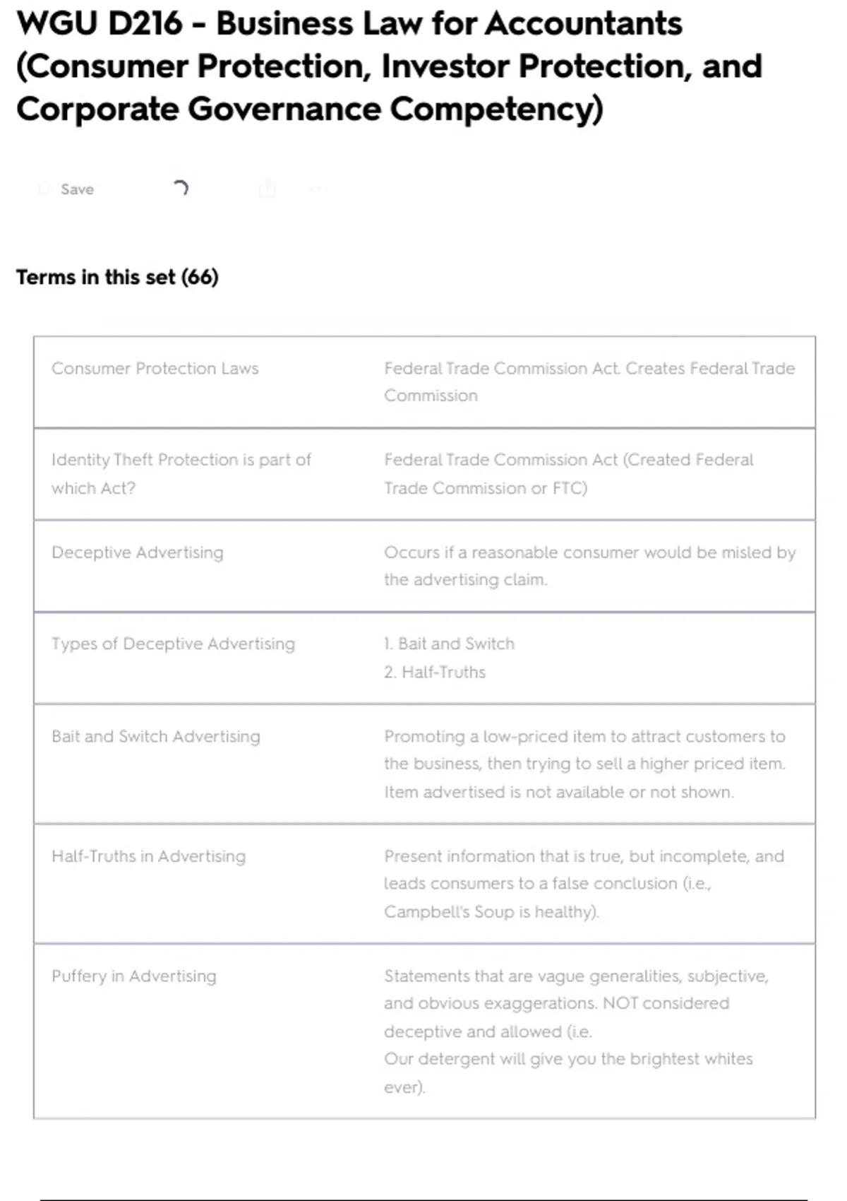 WGU D216 - Business Law for Accountants (Consumer Protection, Investor Protection, and Corporate Governance Competency)