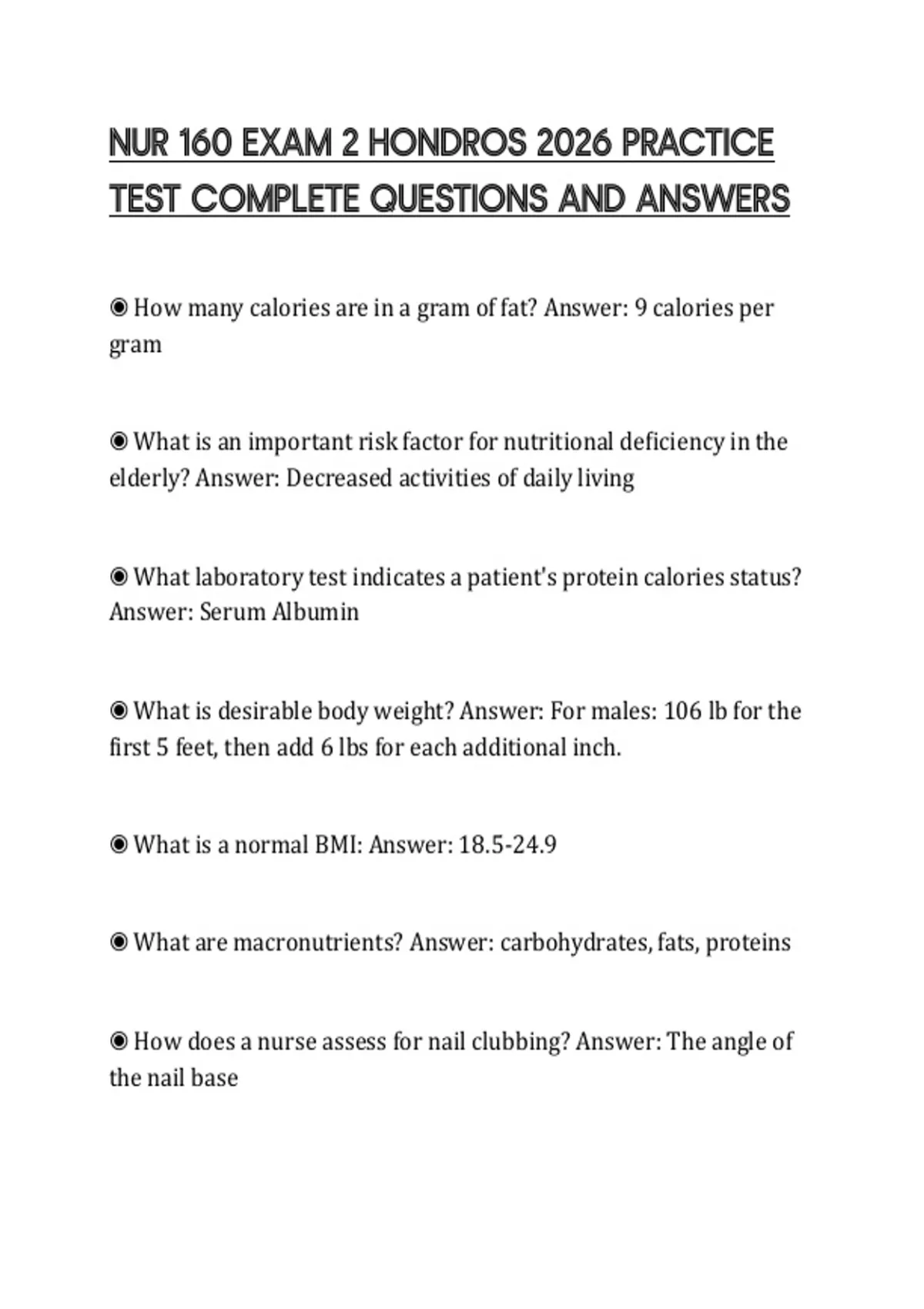 NUR 160 EXAM 2 HONDROS 2026 PRACTICE TEST COMPLETE QUESTIONS AND ANSWERS