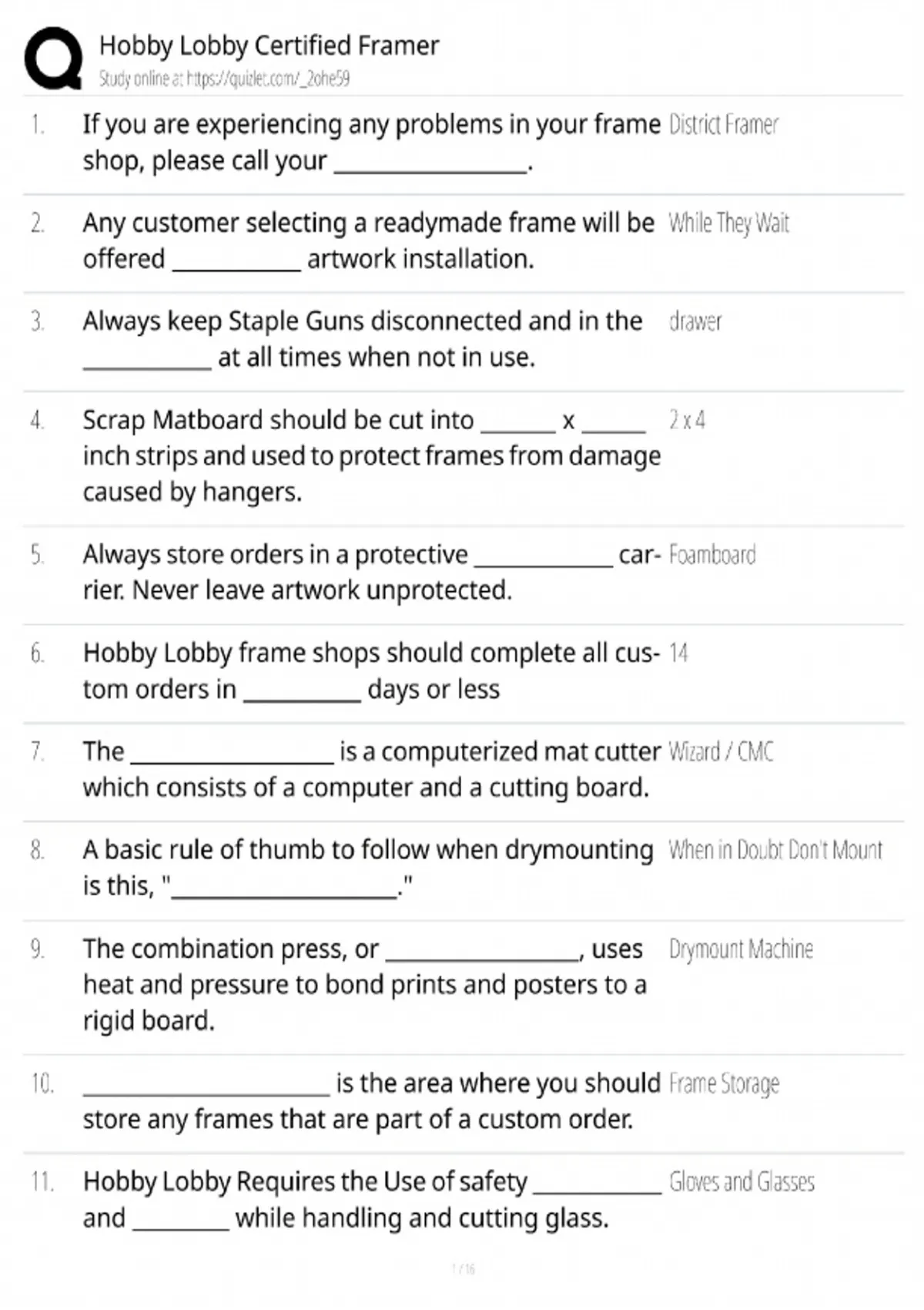 Hobby Lobby Certified Framer / Picture Framing Exam & Study Guide / 2025 Test Bank & Skills Assessment