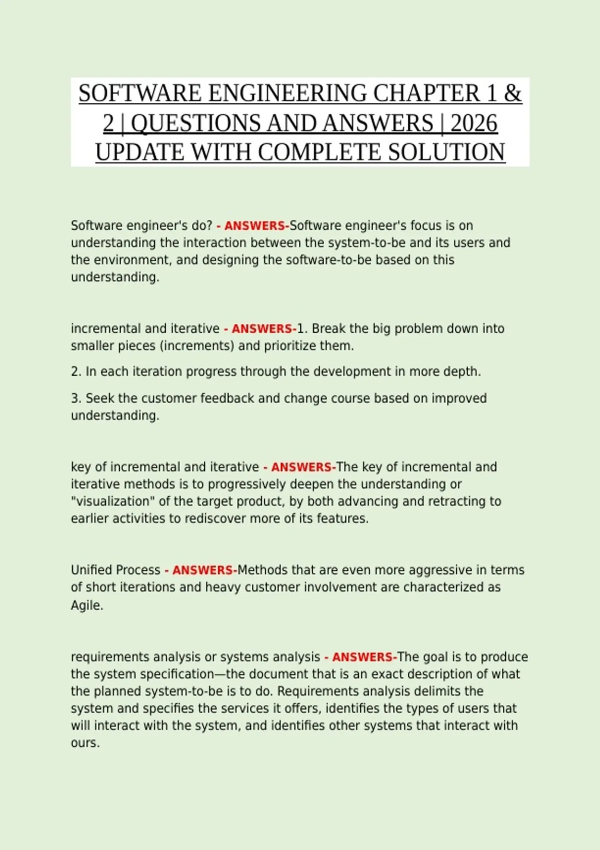 This document is a comprehensive study resource for students covering Software Engineering Chapters 1 & 2, updated for 2026. It contains exam-style questions with verified answers and complete solutions, providing a reliable guide for review, practice, and exam preparation. The content covers fundamental software engineering concepts, including software development life cycle (SDLC), software processes, requirements gathering, system design principles, and basic software modeling techniques. Each question includes detailed step-by-step solutions, helping learners strengthen understanding, critical thinking, and application of core concepts.