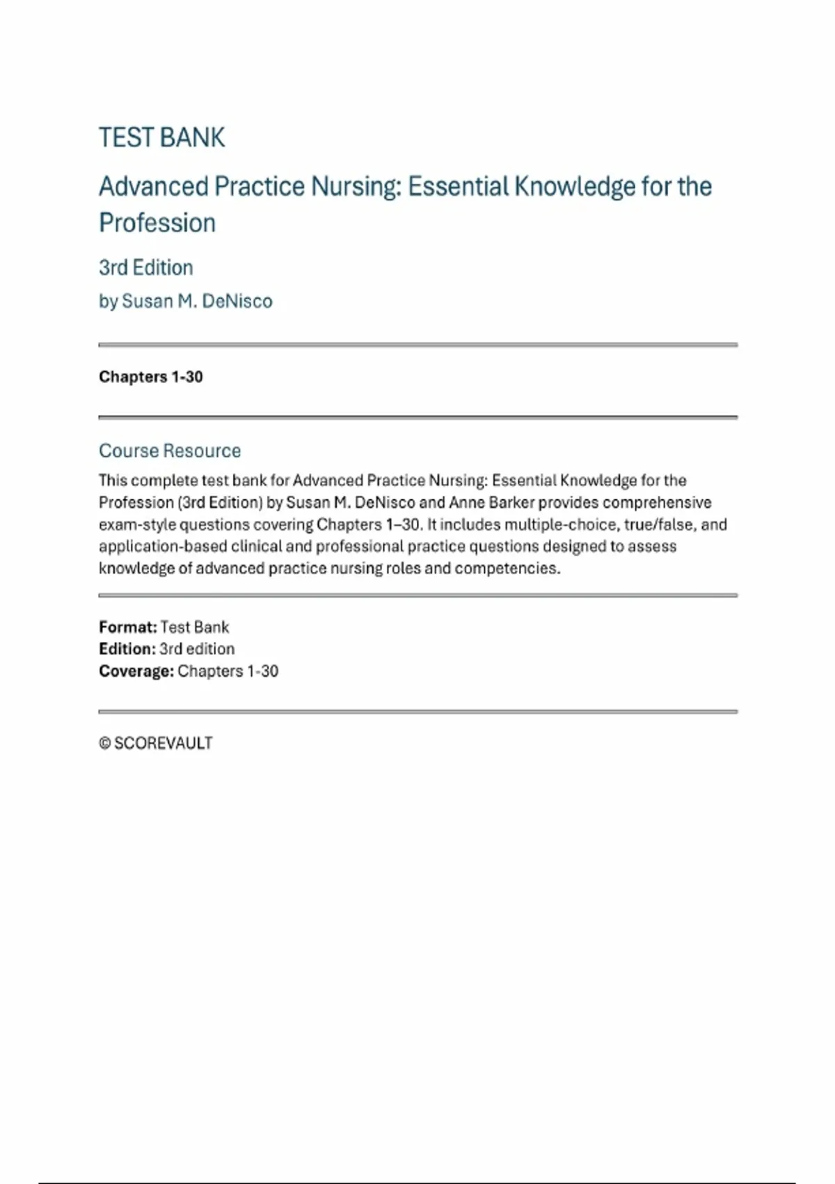 Advanced Practice Nursing: Essential Knowledge for the Profession (3rd Edition, Susan M. DeNisco & Anne Barker) — Complete Test Bank (Chapters 1–30)