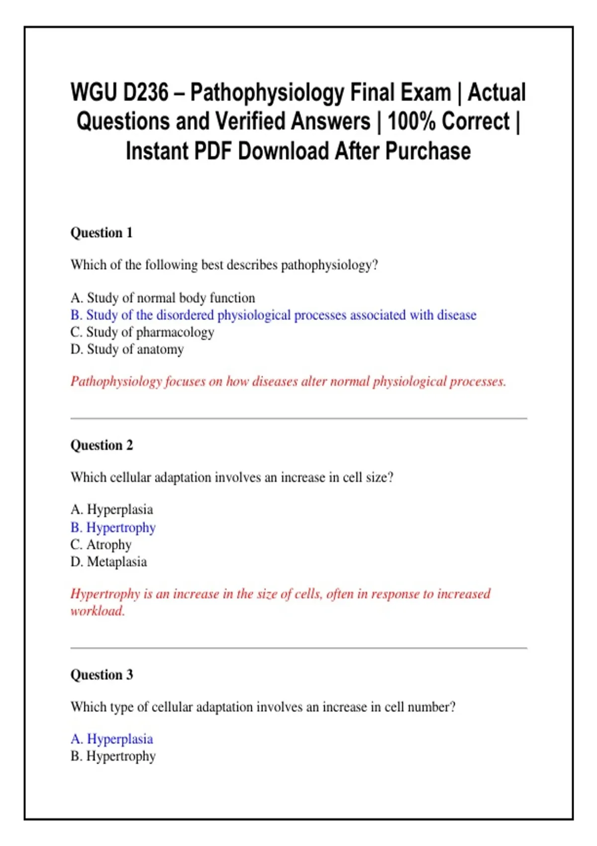 WGU D236 – Pathophysiology Final Exam | Actual Questions and Verified Answers | 100% Correct | Instant PDF Download After Purchase Cellular and tissue pathology Cardiovascular, respiratory, and renal disorders Endocrine, metabolic, and neurological conditions Immunologic and infectious diseases Inflammatory and neoplastic disorders Clinical application of pathophysiological principles in nursing care Patient assessment and disease progression understanding