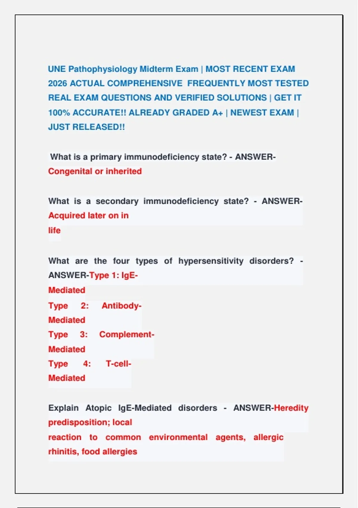 UNE Pathophysiology Midterm Exam | MOST RECENT EXAM 2026 ACTUAL COMPREHENSIVE FREQUENTLY MOST TESTED REAL EXAM QUESTIONS AND VERIFIED SOLUTIONS | GET IT 100% ACCURATE!! ALREADY GRADED A+ | NEWEST EXAM | JUST RELEASED!!