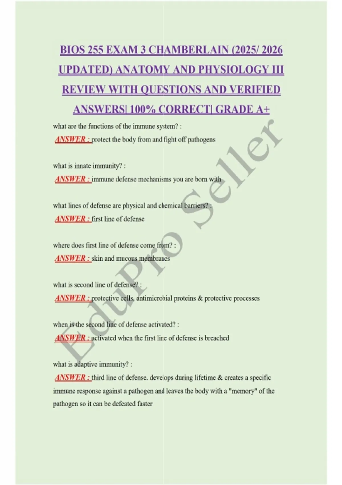BIOS 255 EXAM 3 CHAMBERLAIN (2025/ 2026 UPDATED) ANATOMY AND PHYSIOLOGY III REVIEW WITH QUESTIONS AND VERIFIED ANSWERS| 100% CORRECT| GRADE A+