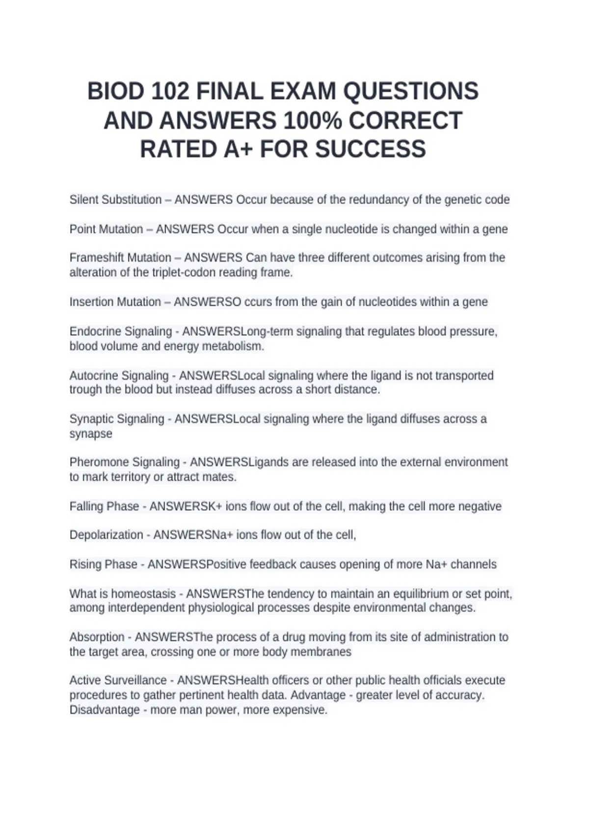 BIOD 102 FINAL EXAM QUESTIONS AND ANSWERS 100% CORRECT RATED A+ FOR SUCCESS