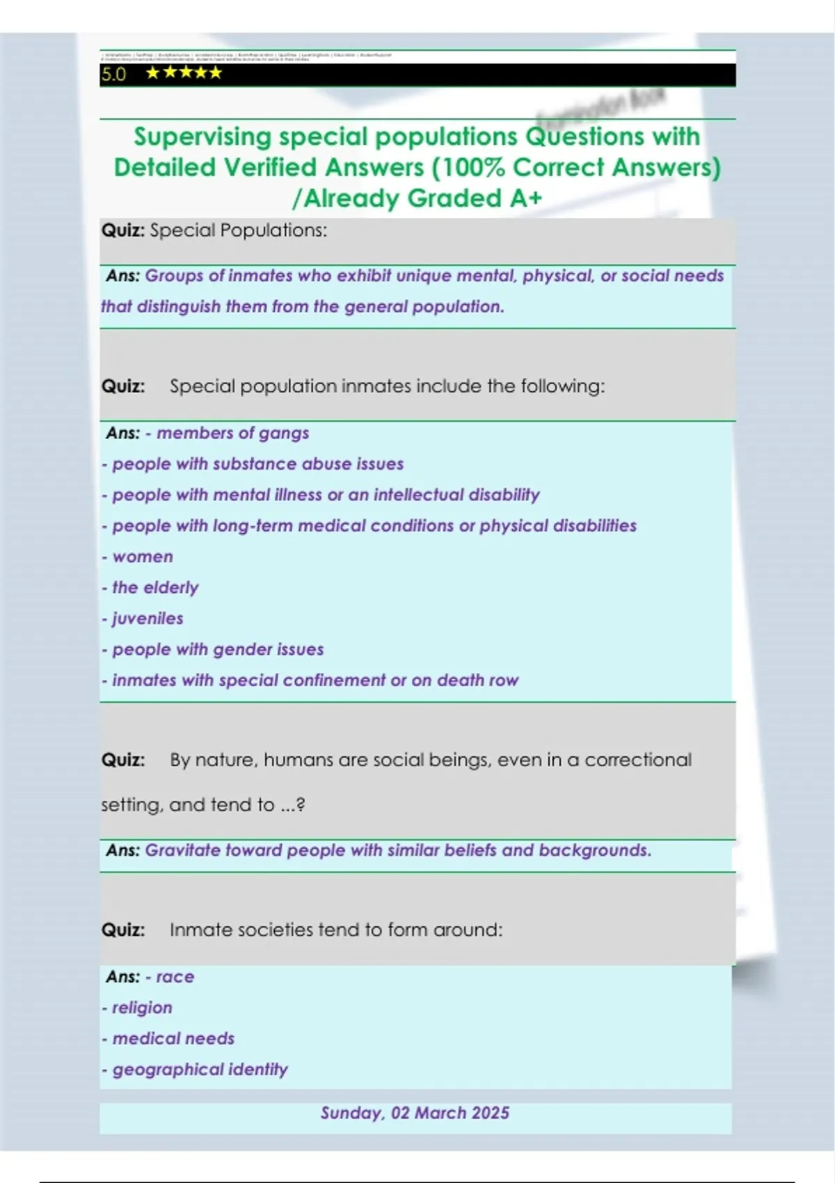 Enhance your skills in supervising special populations with this comprehensive study guide. Covers essential strategies, best practices, and professional standards for managing diverse populations across healthcare, educational, and correctional settings. Includes practice questions with detailed explanations to reinforce knowledge, support exam preparation, and build confidence in practical supervisory skills.