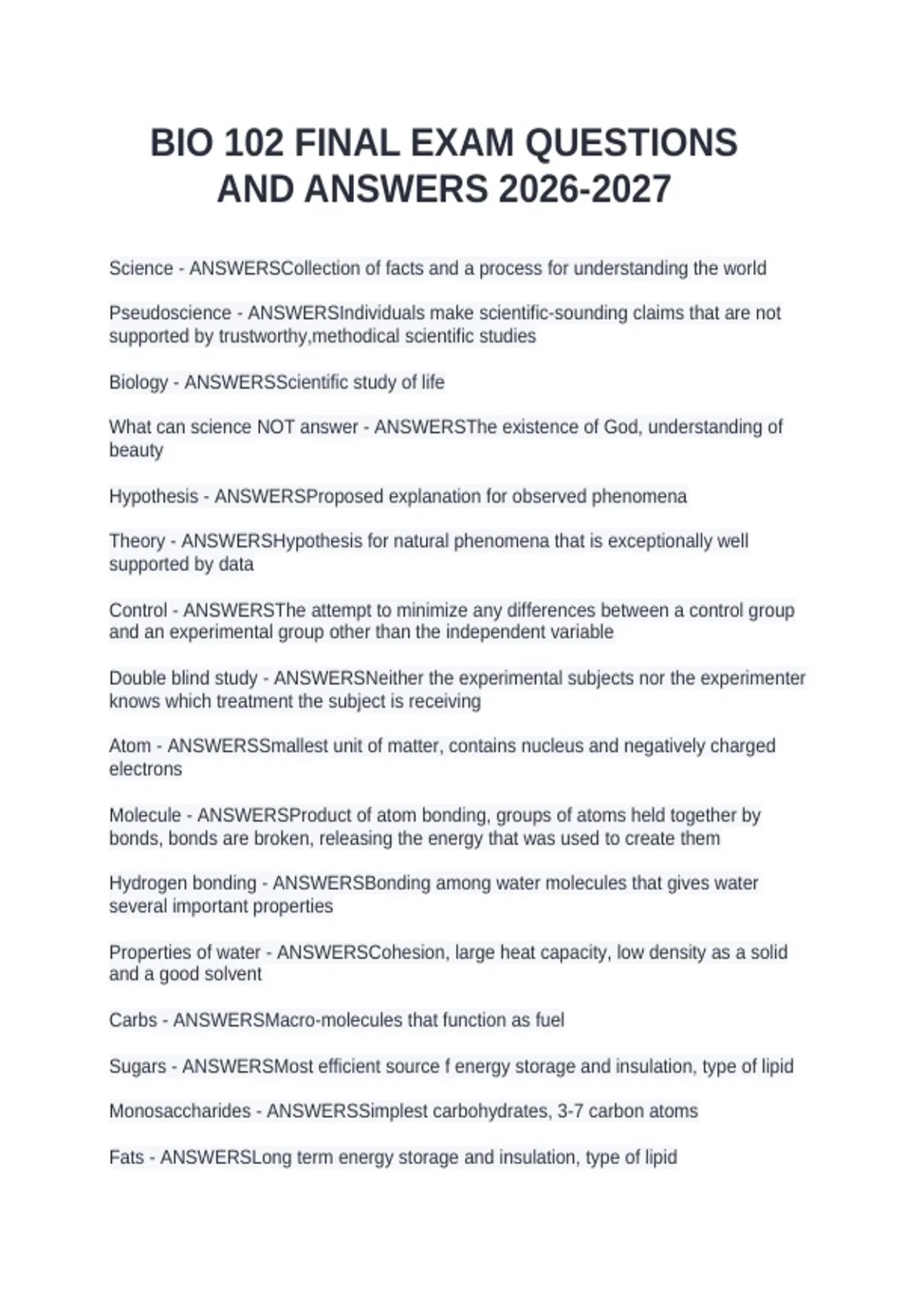 BIO 102 FINAL EXAM QUESTIONS AND ANSWERS