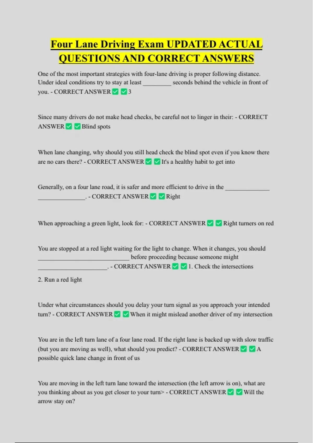 Four Lane Driving Exam UPDATED ACTUAL QUESTIONS AND CORRECT ANSWERS One of the most important strategies with four-lane driving is proper following distance. Under ideal conditions try to stay at least _________ seconds behind the vehicle in front of you. - CORRECT ANSWER 3 Since many drivers do not make head checks, be careful not to linger in their: - CORRECT ANSWER Blind spots When lane changing, why should you still head check the blind spot even if you know there are no cars there? - CORRECT ANSWER It's a healthy habit to get into Generally, on a four lane road, it is safer and more efficient to drive in the ______________ _______________. - CORRECT ANSWER Right When approaching a green light, look for: - CORRECT ANSWER Right turners on red You are stopped at a red light waiting for the light to change. When it changes, you should _____________________________ before proceeding because someone might ______________________. - CORRECT ANSWER 1. Check the intersections 2. Run a red light Under what circumstances should you delay your turn signal as you approach your intended turn? - CORRECT ANSWER When it might mislead another driver of my intersection You are in the left turn lane of a four lane road. If the right lane is backed up with slow traffic (but you are moving as well), what should you predict? - CORRECT ANSWER possible quick lane change in front of us A