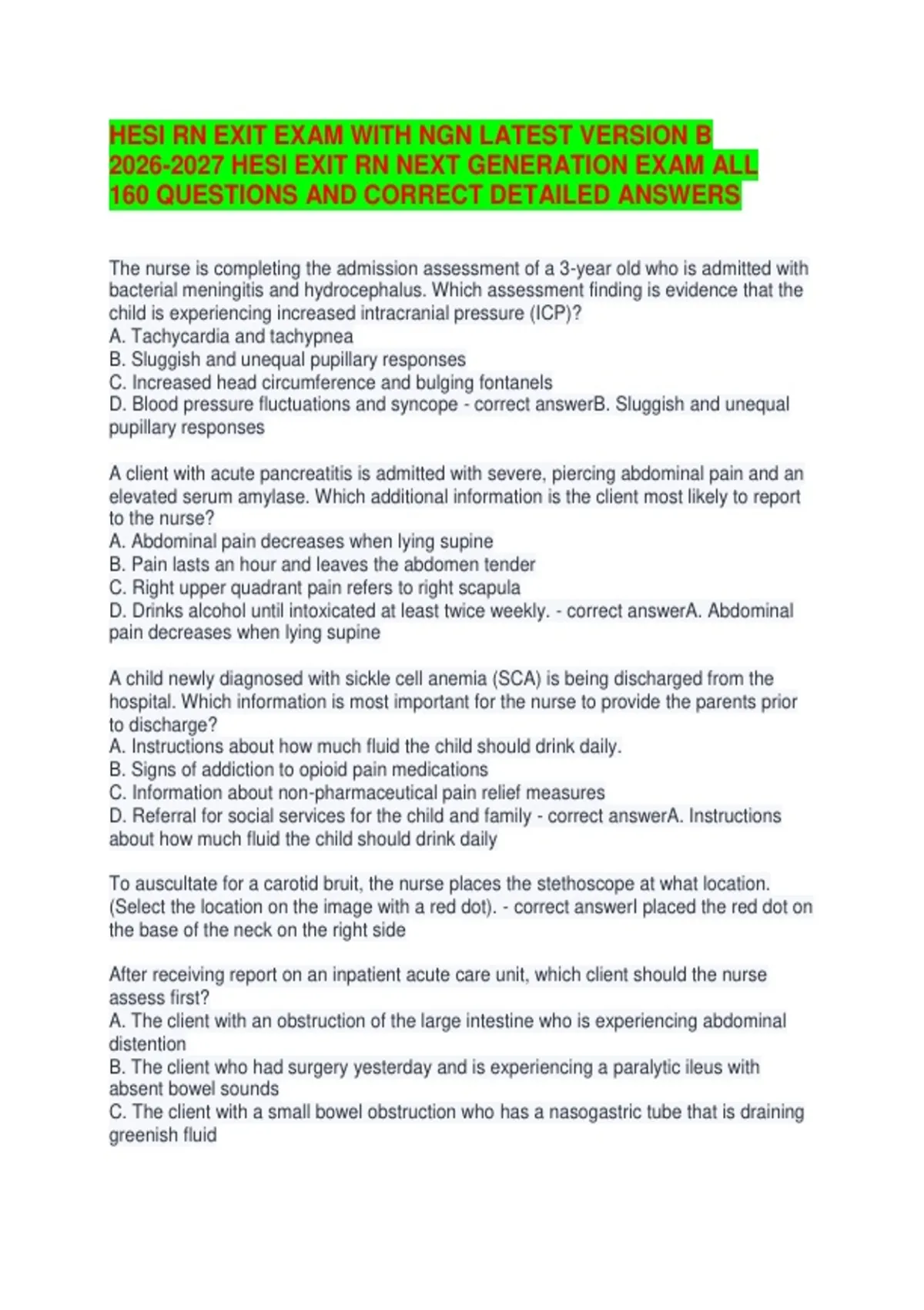 HESI RN EXIT EXAM WITH NGN LATEST VERSION B HESI EXIT RN NEXT GENERATION EXAM ALL 160 QUESTIONS AND CORRECT DETAILED ANSWERS