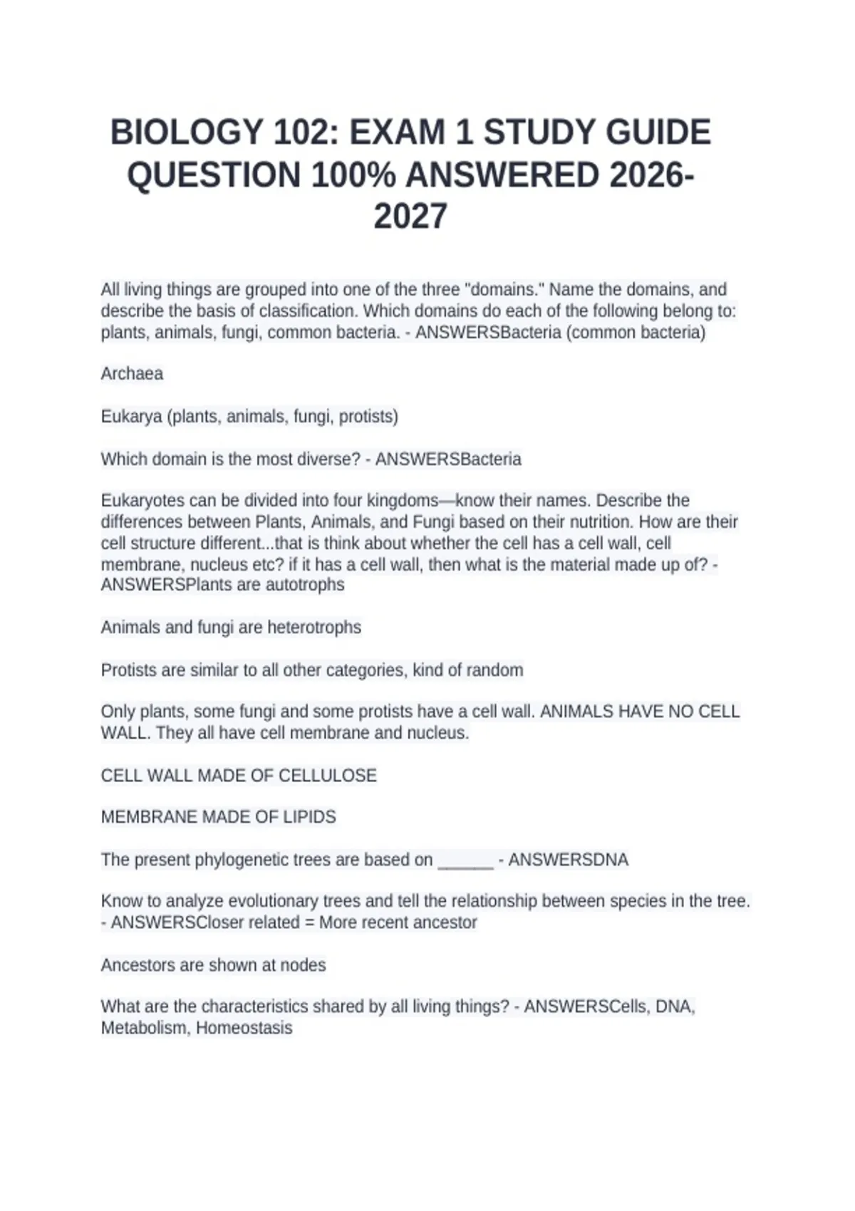 BIOLOGY 102: EXAM 1 STUDY GUIDE QUESTION 100% ANSWERED