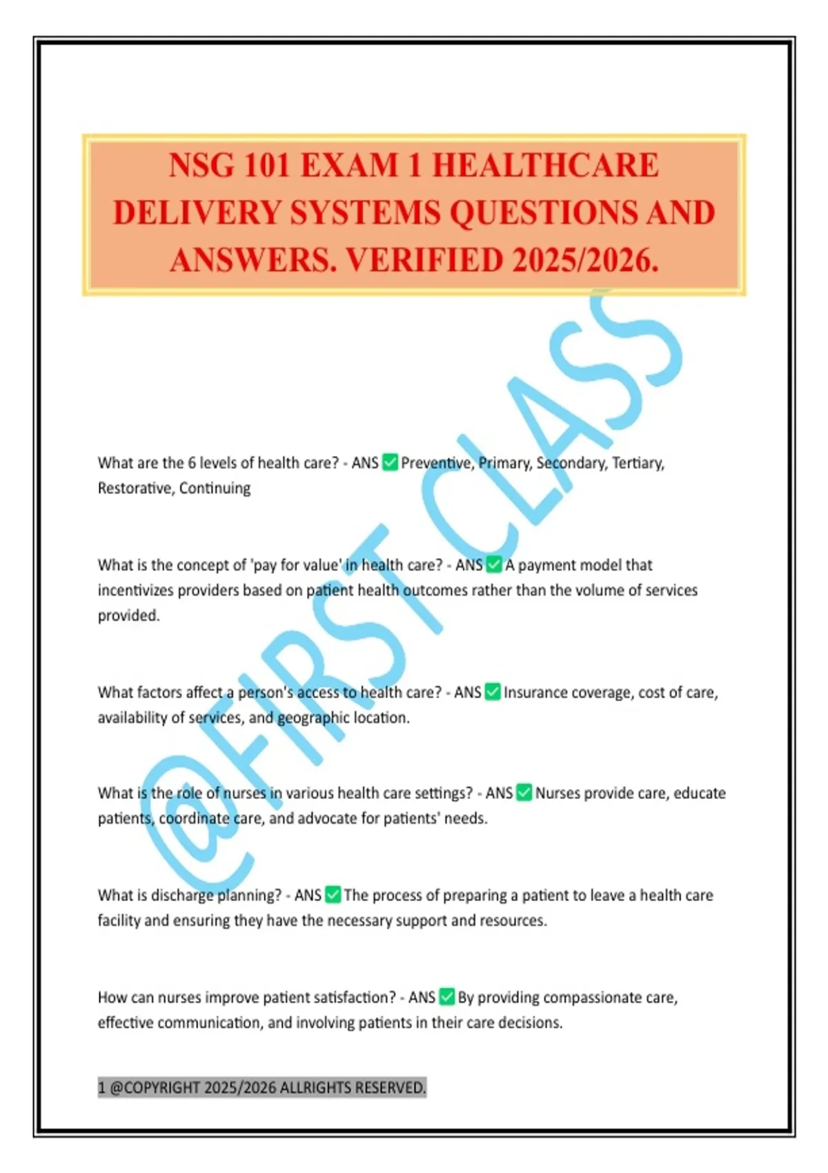 NSG 101 EXAM 1 HEALTHCARE DELIVERY SYSTEMS QUESTIONS AND ANSWERS. VERIFIED 2025/2026.