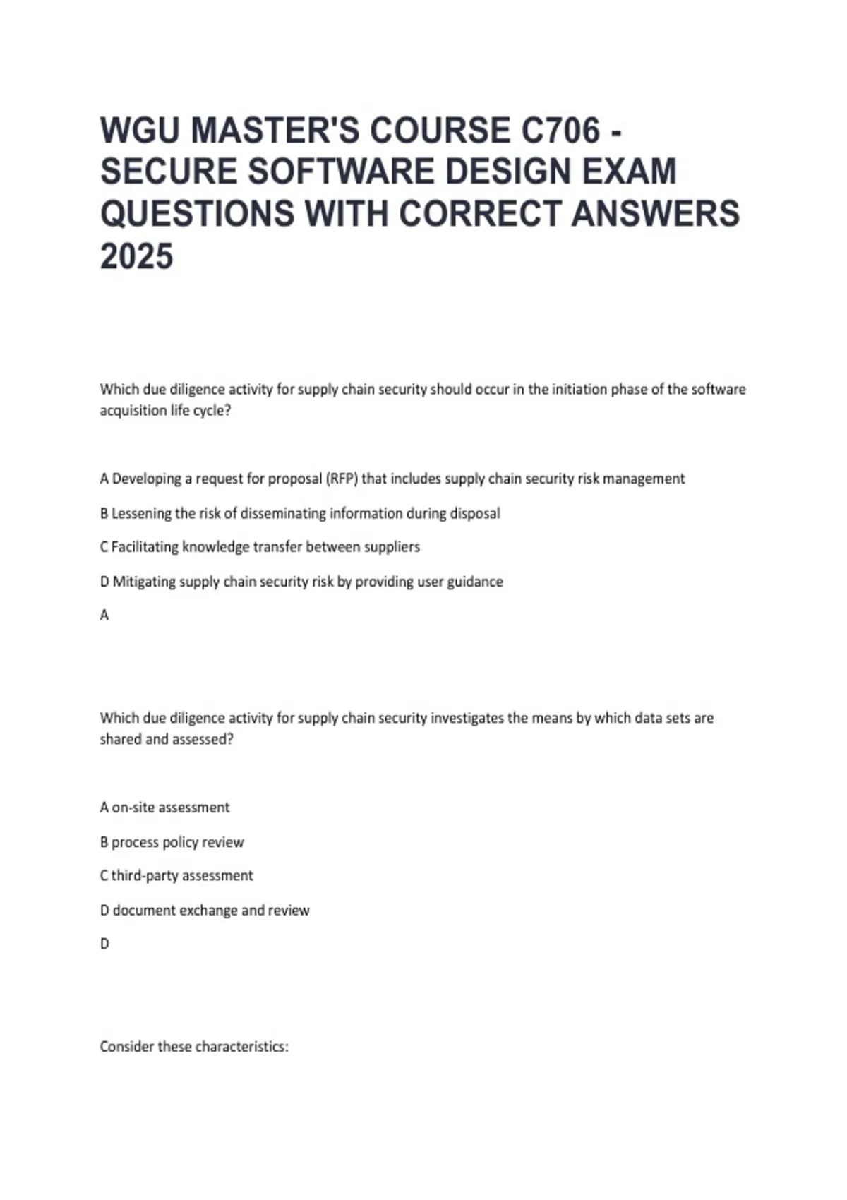 Prepare effectively for the WGU Master’s Course C706 – Secure Software Design exam with this comprehensive guide. Includes exam-style questions and detailed solutions covering secure coding practices, threat modeling, software lifecycle security, vulnerability mitigation, and risk assessment strategies. Designed for WGU students seeking structured exam preparation, concept mastery, and confidence to excel in C706 assessments.