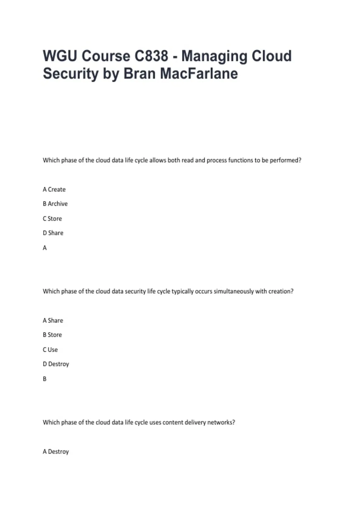 Prepare effectively for WGU C838 – Managing Cloud Security with this comprehensive study guide by Bran. Includes practice questions and detailed explanations covering cloud security principles, risk management, access control, compliance standards, encryption, and incident response strategies. Designed for WGU students seeking structured exam preparation, concept mastery, and confidence to excel in C838 assessments.