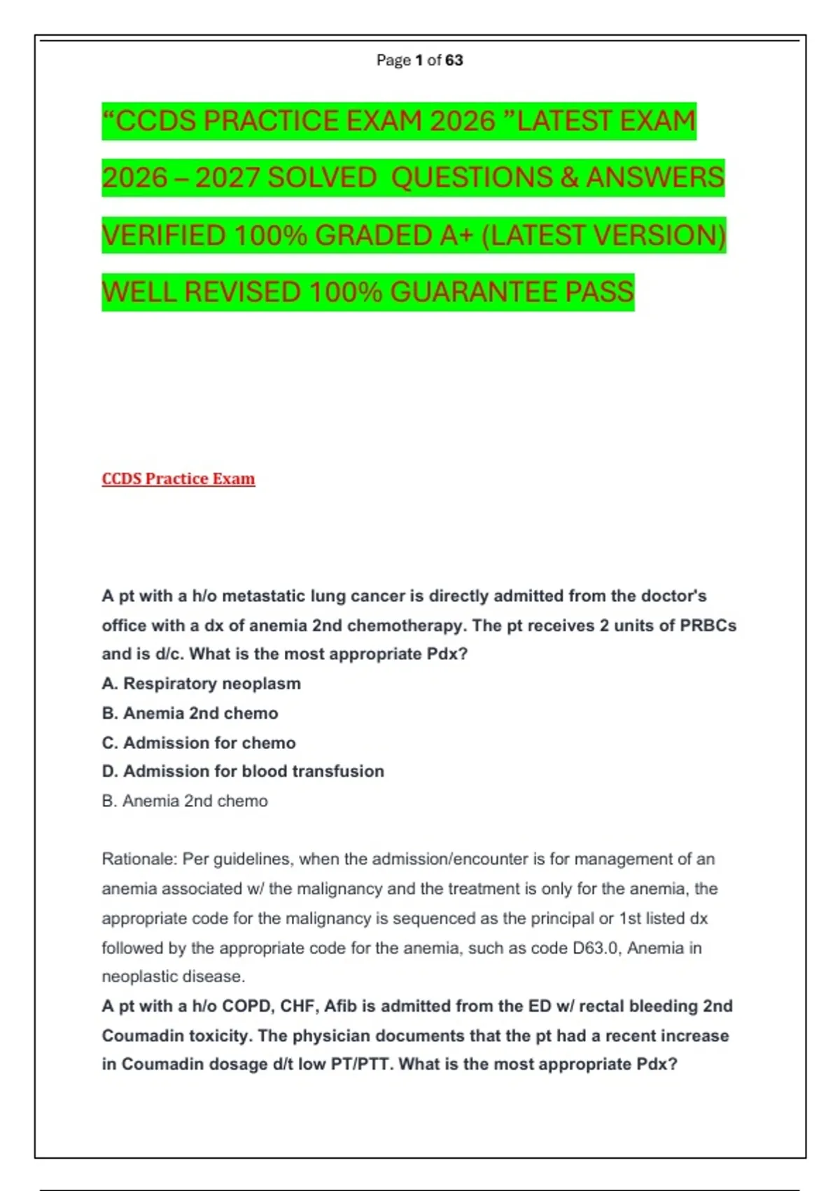 “CCDS PRACTICE EXAM 2026 ”LATEST EXAM 2026 – 2027 SOLVED QUESTIONS & ANSWERS VERIFIED 100% GRADED A+ (LATEST VERSION) WELL REVISED 100% GUARANTEE PASS
