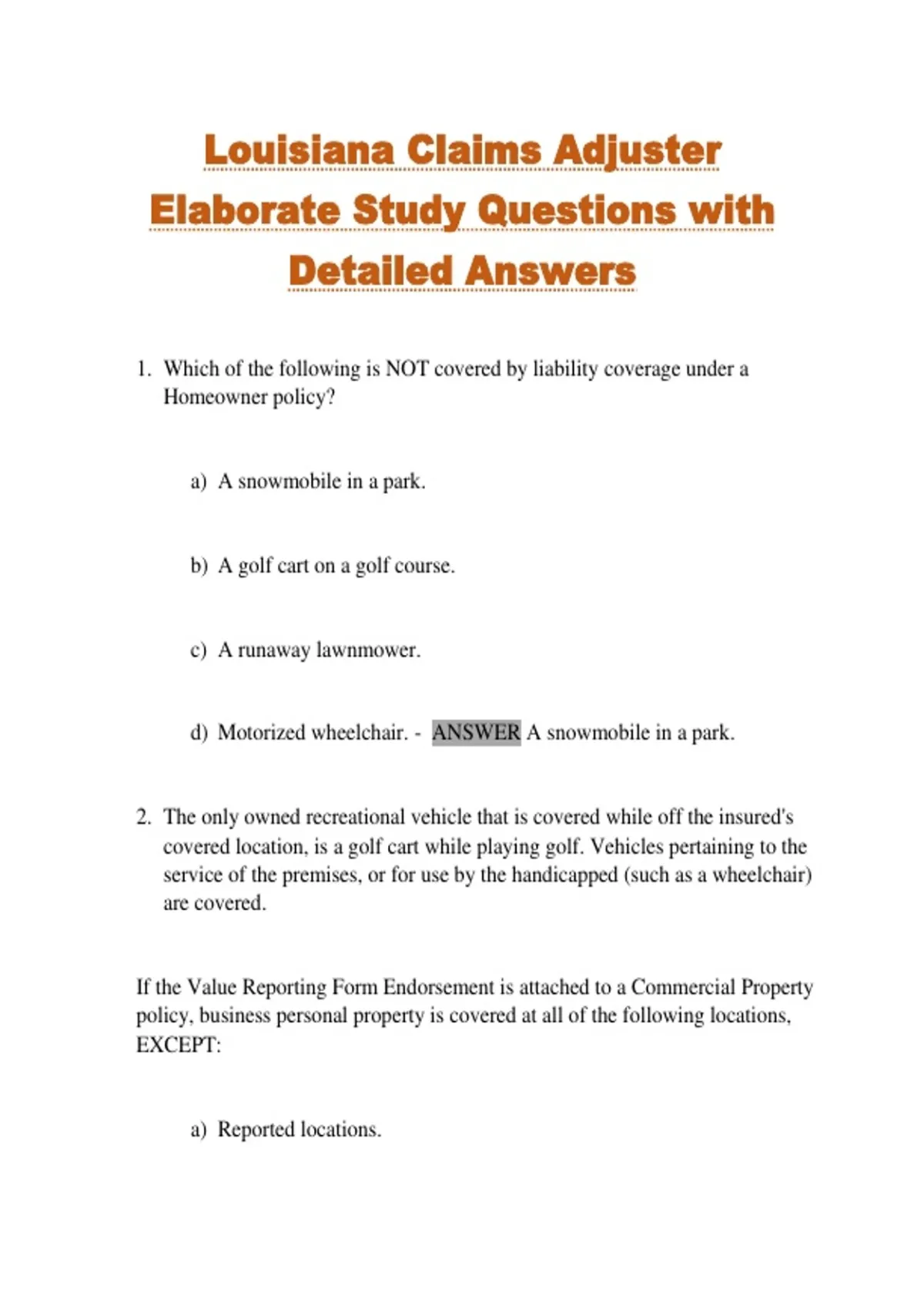 Louisiana Claims Adjuster Elaborate Study Questions with Detailed Answers 1. Which of the following is NOT covered by liability coverage under a Homeowner policy? a) A snowmobile in a park. b) A golf cart on a golf course. c) A runaway lawnmower. d) Motorized wheelchair. - ANSWER A snowmobile in a park. 2. The only owned recreational vehicle that is covered while off the insured's covered location, is a golf cart while playing golf. Vehicles pertaining to the service of the premises, or for use by the handicapped (such as a wheelchair) are covered. If the Value Reporting Form Endorsement is attached to a Commercial Property policy, business personal property is covered at all of the following locations, EXCEPT: a) Reported locations. b) Exhibition locations. c) Acquired locations. d) Incidental locations. - ANSWER Exhibition locations. 3. Sudden and Accidental Tearing Apart - ANSWER may cover damages caused by rupture, cracking, burning, or bulging of a steam or hot water heating system 4. Scheduled payment release - ANSWER also referred to as " opened-ended" or "rehabilitation settlement. 5. SFP does not cover - ANSWER accounts, bills, currency, deeds, evidences of debt, and money 6. SFP does cover loss by fire caused directly by rebellion - ANSWER false, standard fire policy is sometimes called a 165-line policy due to the standard form is use in most states. 7. When a specific event occurs - ANSWER the claim amount may be fixed or as part of the actual loss occurred 8. Professional insurance policies - ANSWER most insurance policies are standard forms- they tend to use boilerplate languages that are similar across different type of policies 9. For vandalism and malicious mischief insurance coverage to take effect the structure must be regularly occupied. - ANSWER false, vandalism and malicious mischief insurance coverage is usually written as an endorsement to property policies to cover against loss by intentional acts of vandals 10. HO Forms 3 has - ANSWER all-peril coverage for structures and named peril coverage for contents 11. HO Forms 5 has - ANSWER all-peril coverage for structures and contents 12. You will recommend HO Form 8 to those who own a building - ANSWER with lower value 13. A hostile fire is one that is - ANSWER not contained within its intended boundaries 14. Susan the wife was cooking and accidently spilled on the kitchen floor. Don the husband didn't see it and slipped, fell and had to be rushed to the hospital. The ER and ambulance cost may be paid for via - ANSWER medical expanse claim 15. Hero the sweet dog bit the hand of the post office guy right next to Mike's door for no reason. Hero never bit anyone before. Mike the dog owner wants the post office guy to drop the lawsuit. He agrees to pay for all damages. What claim should he file? - ANSWER bodily injury claim 16. Pete was grilling and somehow a fire started which was just enough to burn the communal shed of his property and has nothing else. He wants to fix the shed. What claim can he make? - ANSWER property damage claim 17. Jim broke into Mark's house and spray painted the walls. Mark's wife Kelly ran after Jim. When Jim escaped he stepped on Mark's Nintendo and broke it. When he pushed open the door to escape the door hit Mark's Xbox and broke it as well. What claim can Mark file? - ANSWER vandalism claim on both 18. Pat was grilling and somehow a fire started which was enough to burn a hole on the roof. Heavy rainfall is expected to come in 48 hours so she made some temporary fixes to prevent water leakage from the roof. - ANSWER she should inform the adjuster about the temporary fixes 19. Pat was grilling and somehow a fire started which was enough to burn half the kitchen. She wanted to repair ASAP. She called in a contractor and a quote was obtained - ANSWER she should try to reach an agreement with the adjuster on the scope of work 20. Jane the food court cleaner is complaining against John's Cafe, saying she slipped on a patch of floor its customers had spilled. But John's Cafe hit back, saying it was her job to clean the spill. Jane wants to settle the matter without going through the court - ANSWER Jane can receive compensation through the Food Court's worker compensation benefits