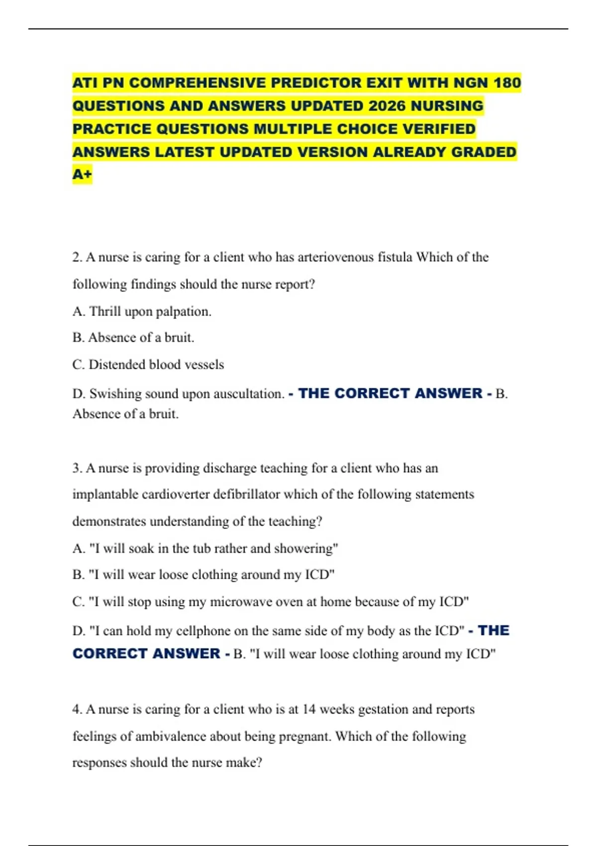 ATI PN COMPREHENSIVE PREDICTOR EXIT WITH NGN 180 QUESTIONS AND ANSWERS UPDATED 2026 NURSING PRACTICE QUESTIONS MULTIPLE CHOICE VERIFIED ANSWERS LATEST UPDATED VERSION ALREADY GRADED A+ 2. A nurse is caring for a client who has arteriovenous fistula Which of the following findings should the nurse report? A. Thrill upon palpation. B. Absence of a bruit. C. Distended blood vessels D. Swishing sound upon auscultation. - THE CORRECT ANSWER - B. Absence of a bruit.