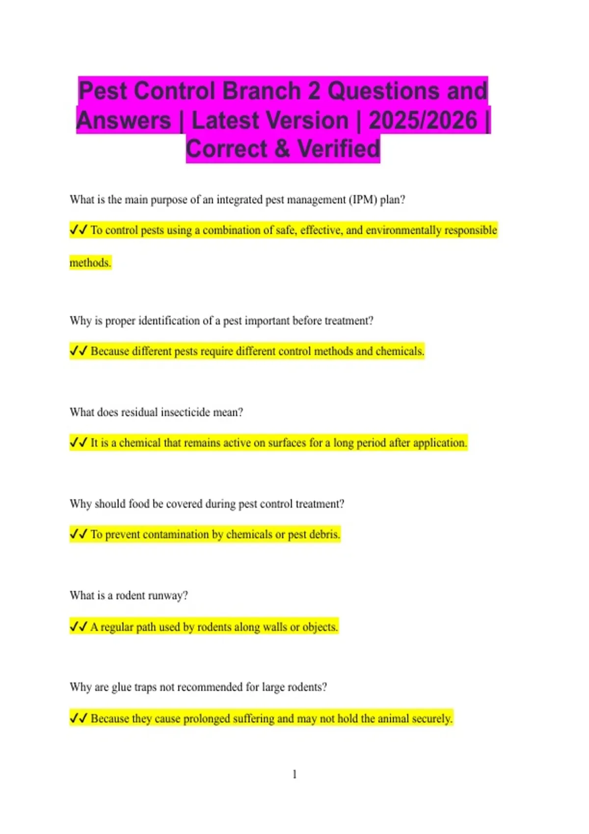 Pest Control Branch 2 Questions and Answers | Latest Version | 2025/2026 | Correct & Verified What is the main purpose of an integrated pest management (IPM) plan? To control pests using a combination of safe, effective, and environmentally responsible methods. Why is proper identification of a pest important before treatment? Because different pests require different control methods and chemicals. What does residual insecticide mean? It is a chemical that remains active on surfaces for a long period after application. Why should food be covered during pest control treatment? To prevent contamination by chemicals or pest debris. What is a rodent runway? A regular path used by rodents along walls or objects. Why are glue traps not recommended for large rodents? Because they cause prolonged suffering and may not hold the animal securely. 2 What is the role of sanitation in pest control? To remove food, water, and shelter that pests need to survive. Why is sealing cracks and gaps important in pest control? To block entry points used by insects and rodents. What does the term “harborage” mean? A place where pests hide or nest. Why should insecticides be rotated periodically? To reduce pest resistance to chemicals. What is a pheromone trap used for? To attract and monitor specific insect species. Why are bed bugs difficult to control? Because they hide well and are resistant to many treatments. What is a contact insecticide? A chemical that kills insects when it touches them. Why should pesticides be stored in original containers? 3 To avoid confusion, spills, and accidental poisoning. What is the safest time to apply outdoor pesticides? Early morning or late evening when beneficial insects are less active. Why is overuse of pesticides harmful? It can cause resistance, environmental damage, and health risks. What does “target pest” mean? The specific pest species being controlled. Why is monitoring important after treatment? To check if the pest problem has been resolved. What is a fumigant? A chemical that kills pests in gaseous form. Why should pest sightings be recorded? To track infestation patterns and treatment success. What is cross-contamination in pest control? When chemicals spread to unintended areas or surfaces. 4 Why is protective clothing important when applying pesticides? To prevent skin contact and inhalation. What is a bait station? A secured container that holds poison bait for pests. Why should baits not be placed in open areas? To prevent access by children, pets, and non-target animals. What is a larvicide? A chemical that kills insect larvae. Why are sticky traps useful indoors? They help monitor and capture crawling insects. What is resistance in pests? When pests become immune to a pesticide. Why should labels on pesticides be read carefully?