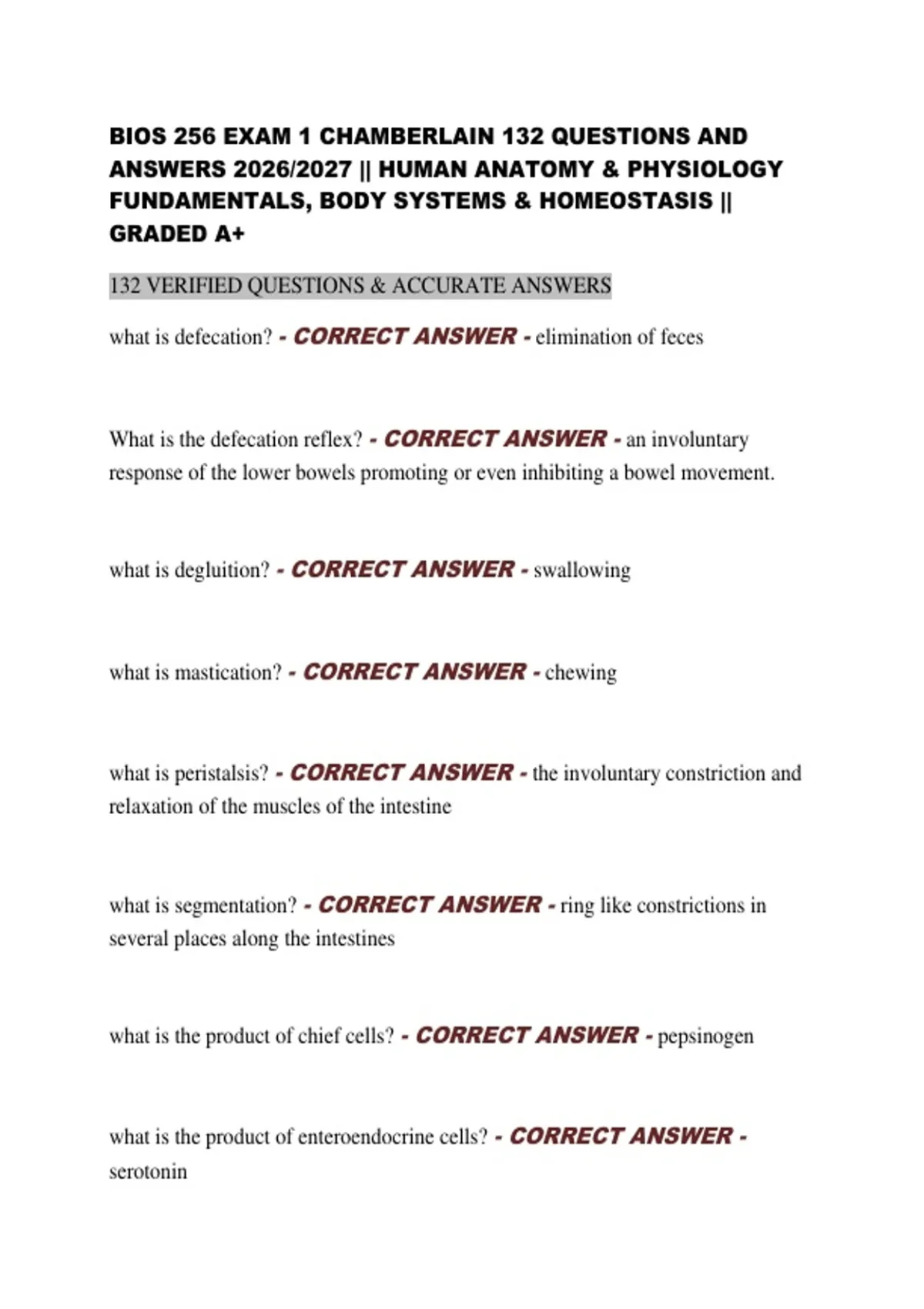 BIOS 256 EXAM 1 CHAMBERLAIN 132 QUESTIONS AND ANSWERS 2026/2027 || HUMAN ANATOMY & PHYSIOLOGY FUNDAMENTALS, BODY SYSTEMS & HOMEOSTASIS || GRADED A+ 132 VERIFIED QUESTIONS & ACCURATE ANSWERS what is defecation? - CORRECT ANSWER - elimination of feces What is the defecation reflex? - CORRECT ANSWER - an involuntary response of the lower bowels promoting or even inhibiting a bowel movement.