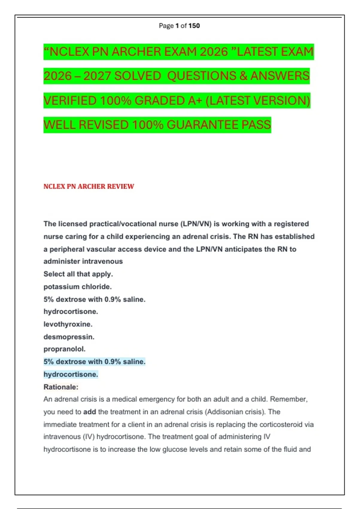 “NCLEX PN ARCHER EXAM 2026 ”LATEST EXAM 2026 – 2027 SOLVED QUESTIONS & ANSWERS VERIFIED 100% GRADED A+ (LATEST VERSION) WELL REVISED 100% GUARANTEE PASS