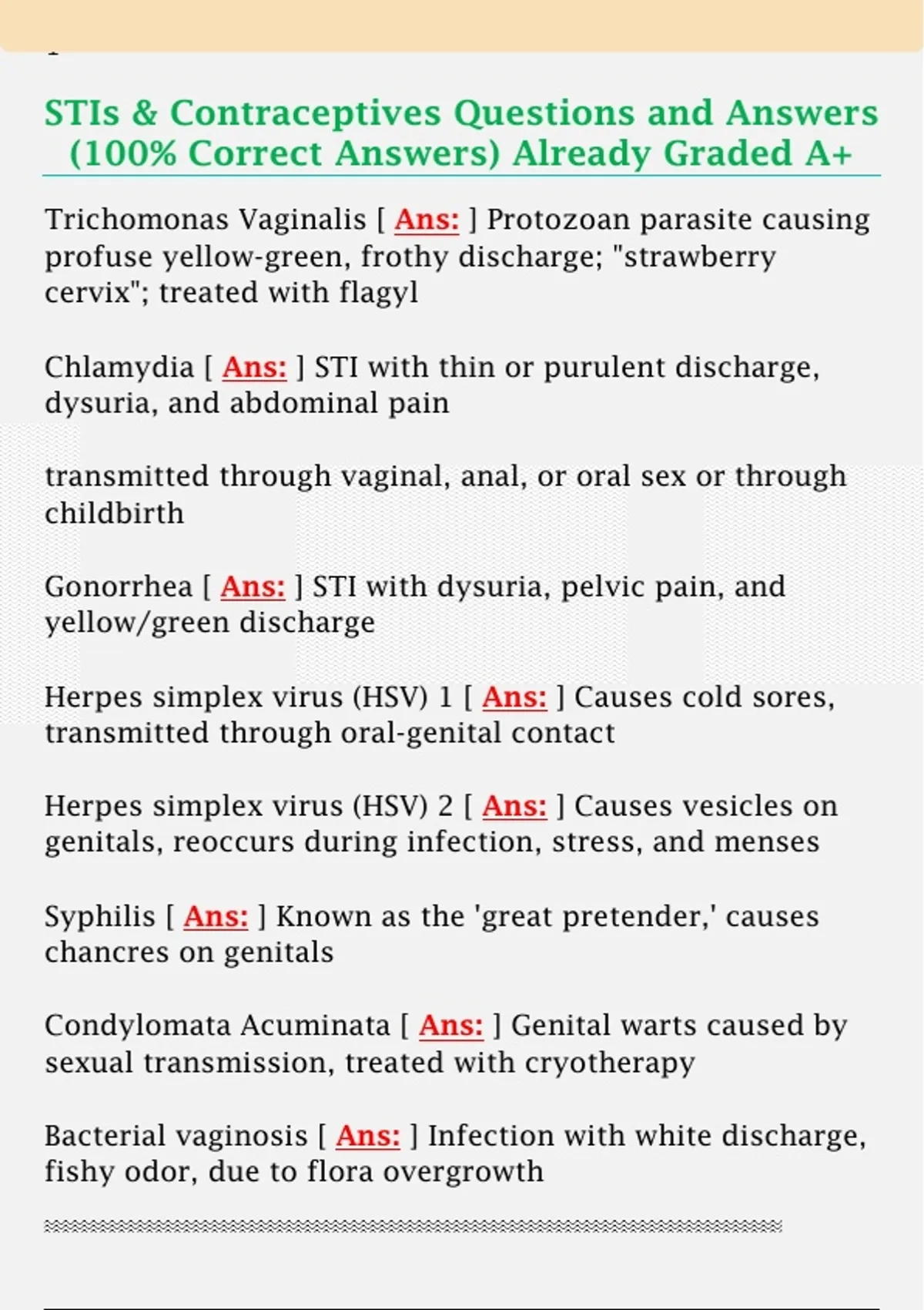 STIs & Contraceptives Questions and Answers (100% Correct Answers) Already Graded A+