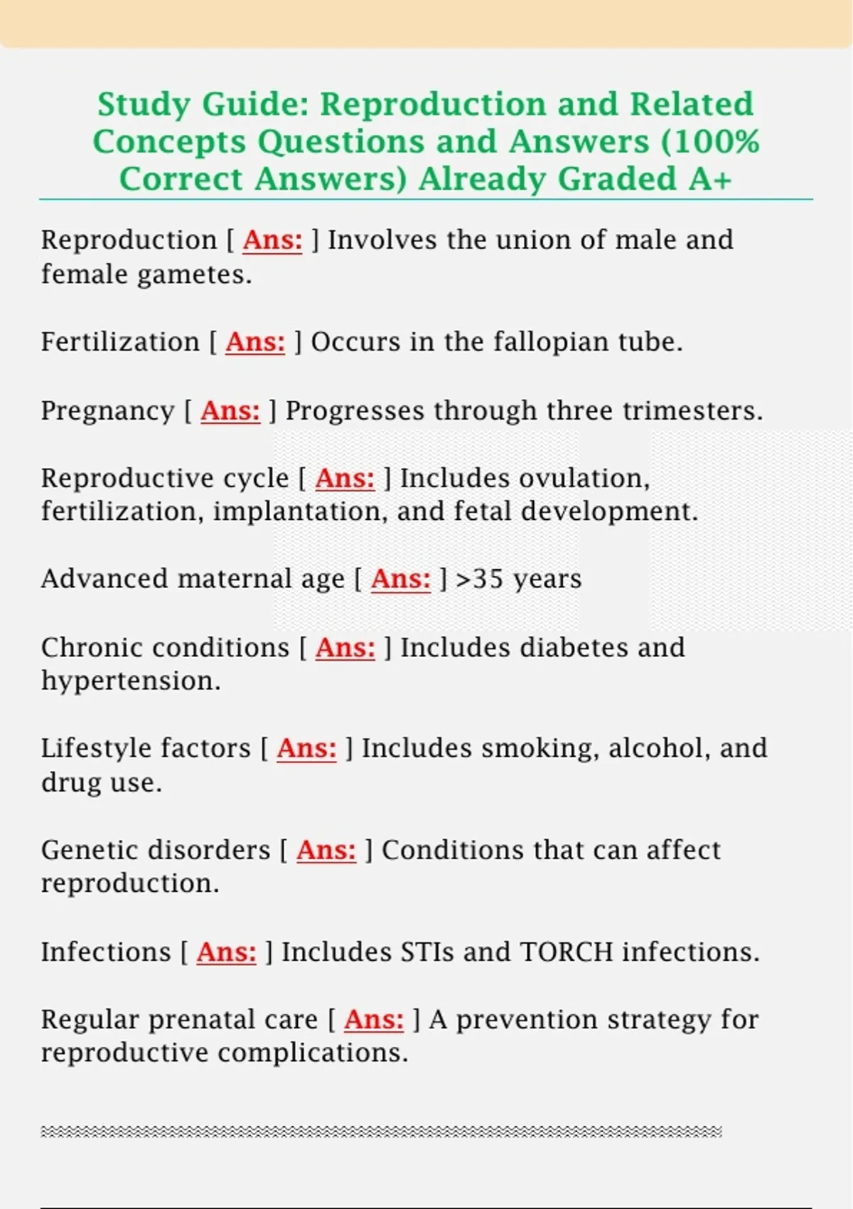 Study Guide: Reproduction and Related Concepts Questions and Answers (100% Correct Answers) Already Graded A+