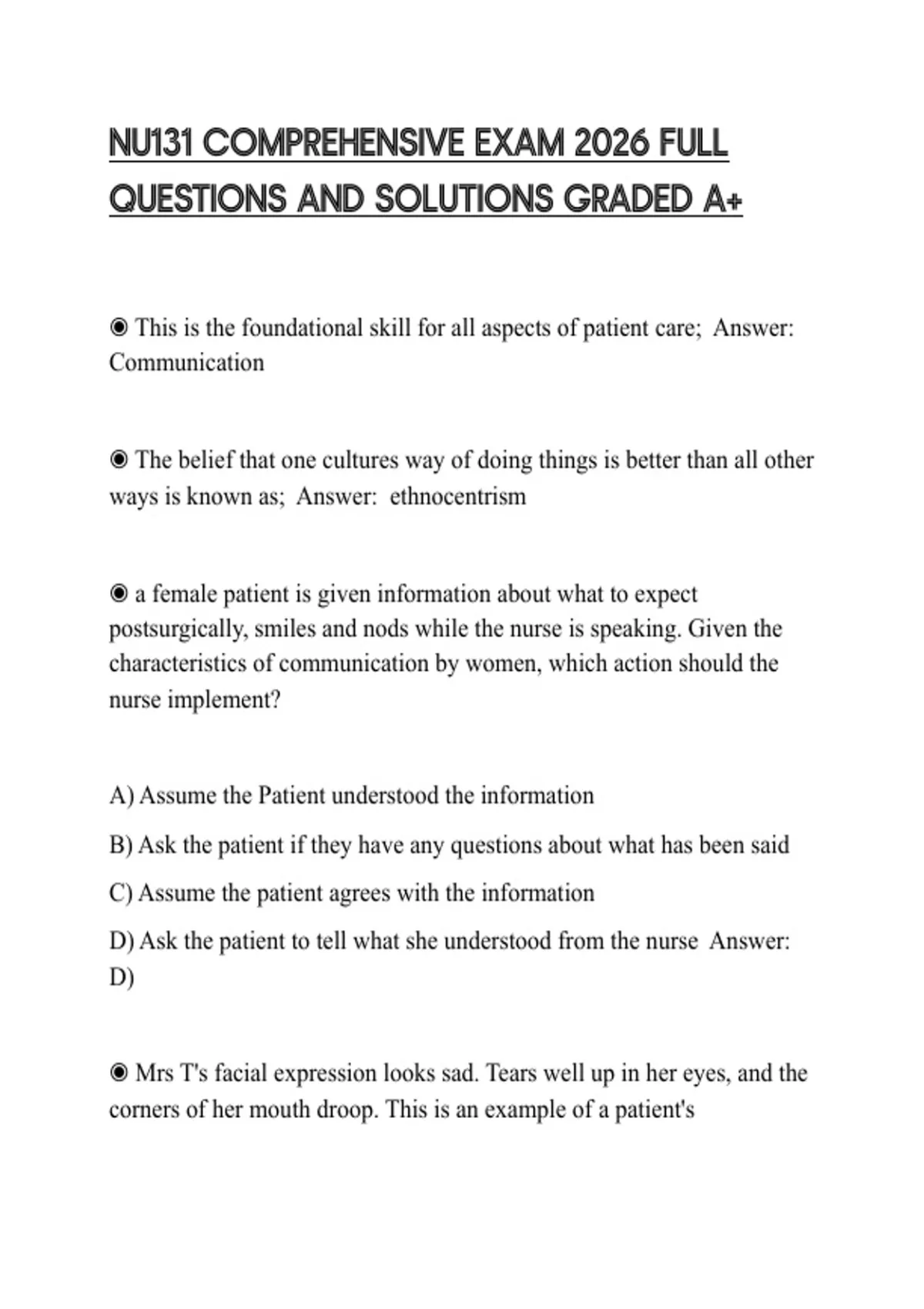 NU131 COMPREHENSIVE EXAM 2026 FULL QUESTIONS AND SOLUTIONS GRADED A+