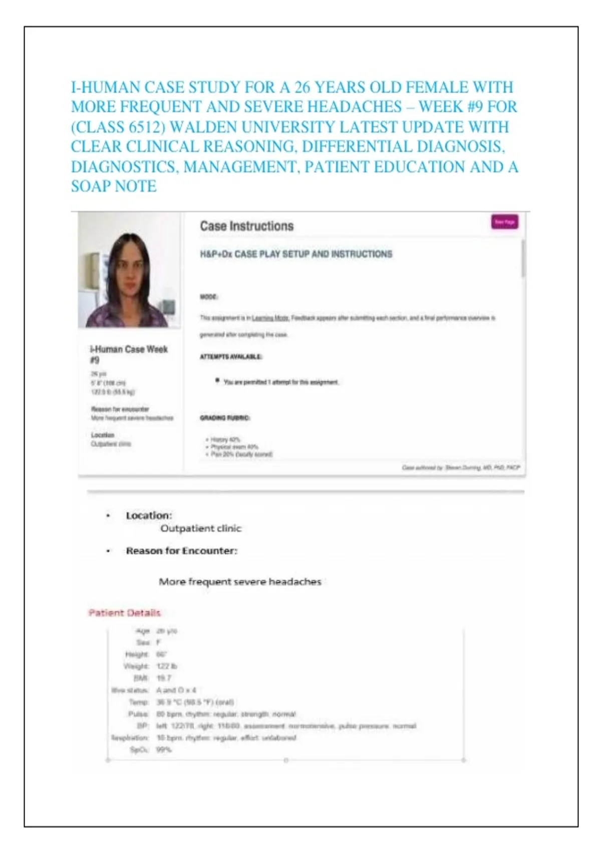 I-HUMAN CASE STUDY FOR A 26 YEARS OLD FEMALE WITH MORE FREQUENT AND SEVERE HEADACHES – WEEK #9 FOR (CLASS 6512) WALDEN UNIVERSITY LATEST UPDATE WITH CLEAR CLINICAL REASONING, DIFFERENTIAL DIAGNOSIS, DIAGNOSTICS, MANAGEMENT, PATIENT EDUCATION AND A SOAP NO