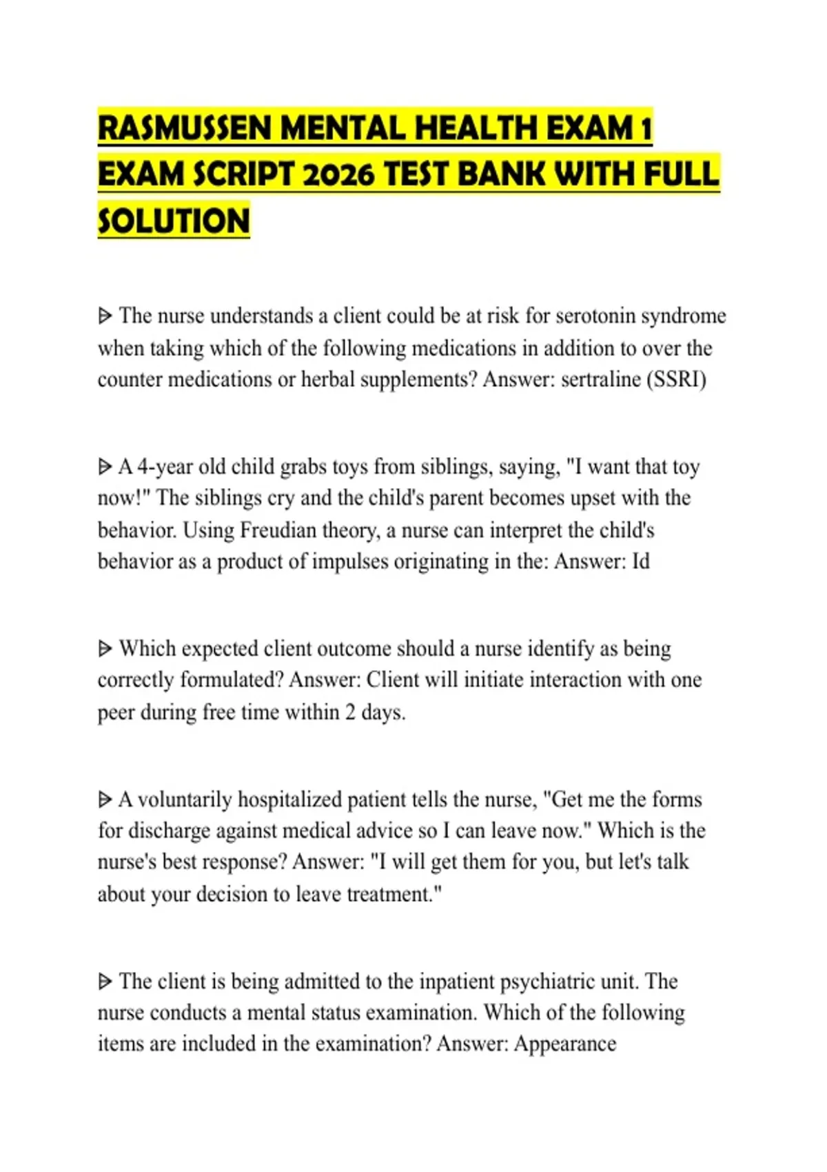 RASMUSSEN MENTAL HEALTH EXAM 1 EXAM SCRIPT 2026 TEST BANK WITH FULL SOLUTION